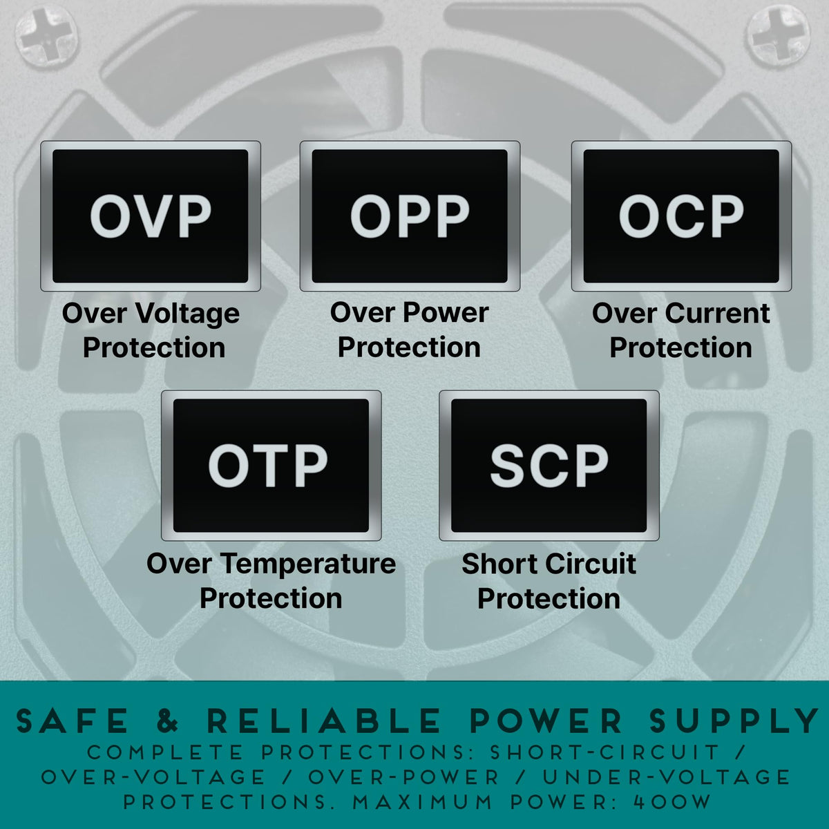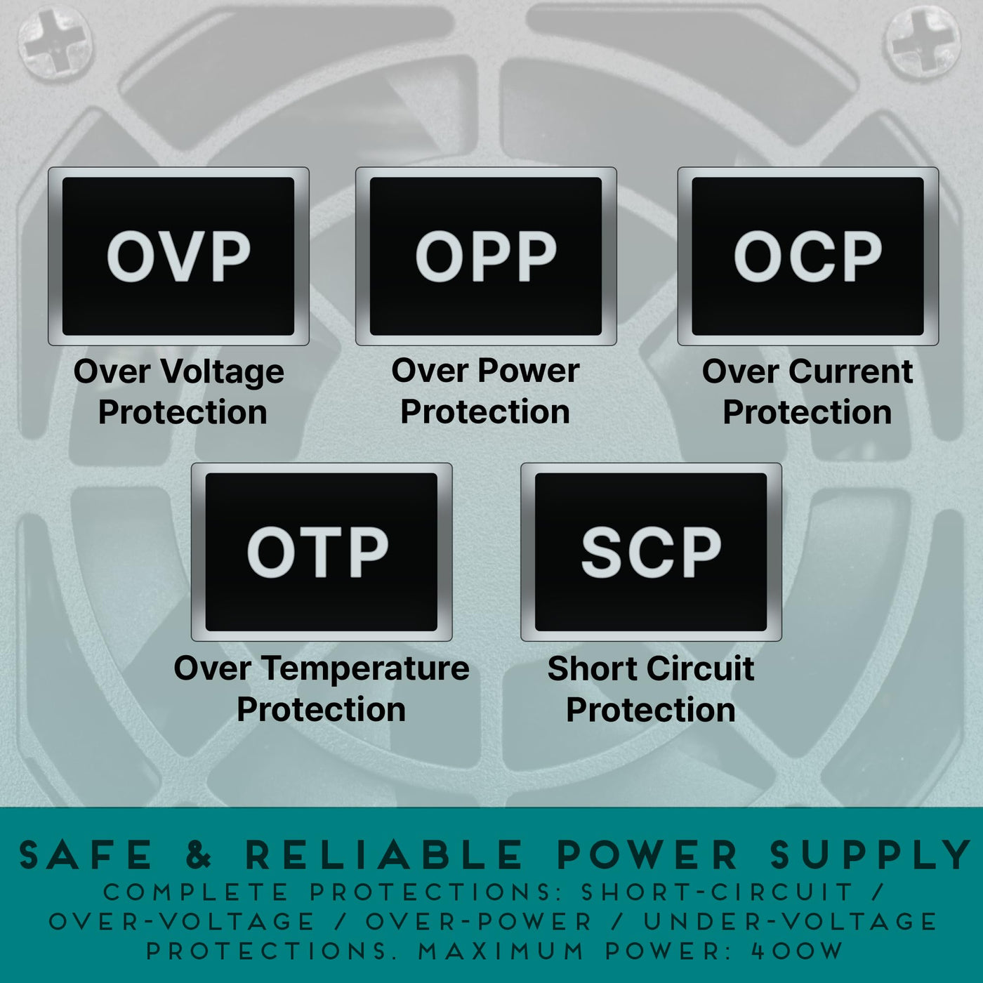 Q: How does the Apevia TFX-PFC400W ensure safe operation?A: The Apevia TFX-PFC400W features several safety protections including Overvoltage Protection (OVP), Overload Protection (OLP), Overcurrent Protection (OCP), Heating Protection (OTP), and Short Circuit Protection (SCP) to ensure safe and reliable operation.