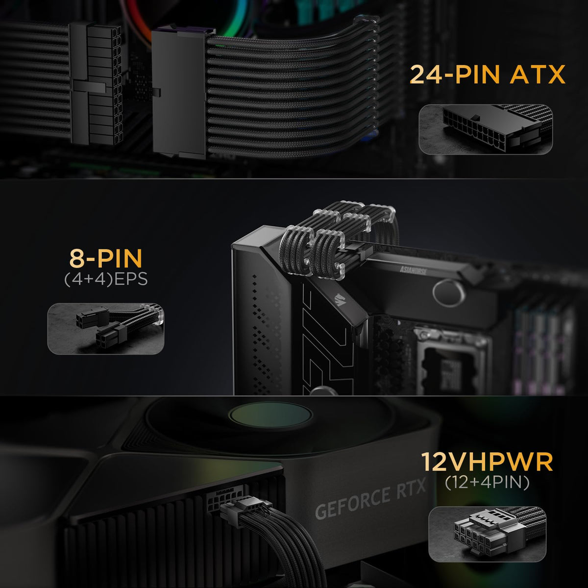 Q: What is the maximum power output supported by the 12VHPWR extension cables?A: The 12VHPWR extension cables can support up to 600W output, making them suitable for ultra-high-performance power supplies. This capability ensures reliable power delivery without the risk of black screens or melted terminals.
