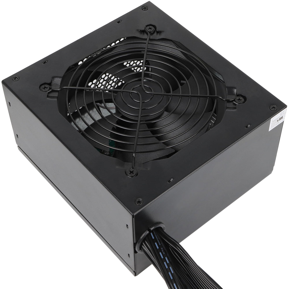 Q: How does the auto-thermally controlled fan work?A: The power supply is equipped with a 120mm black fan that automatically adjusts its speed based on the internal temperature, providing silent operation while maintaining optimal cooling.