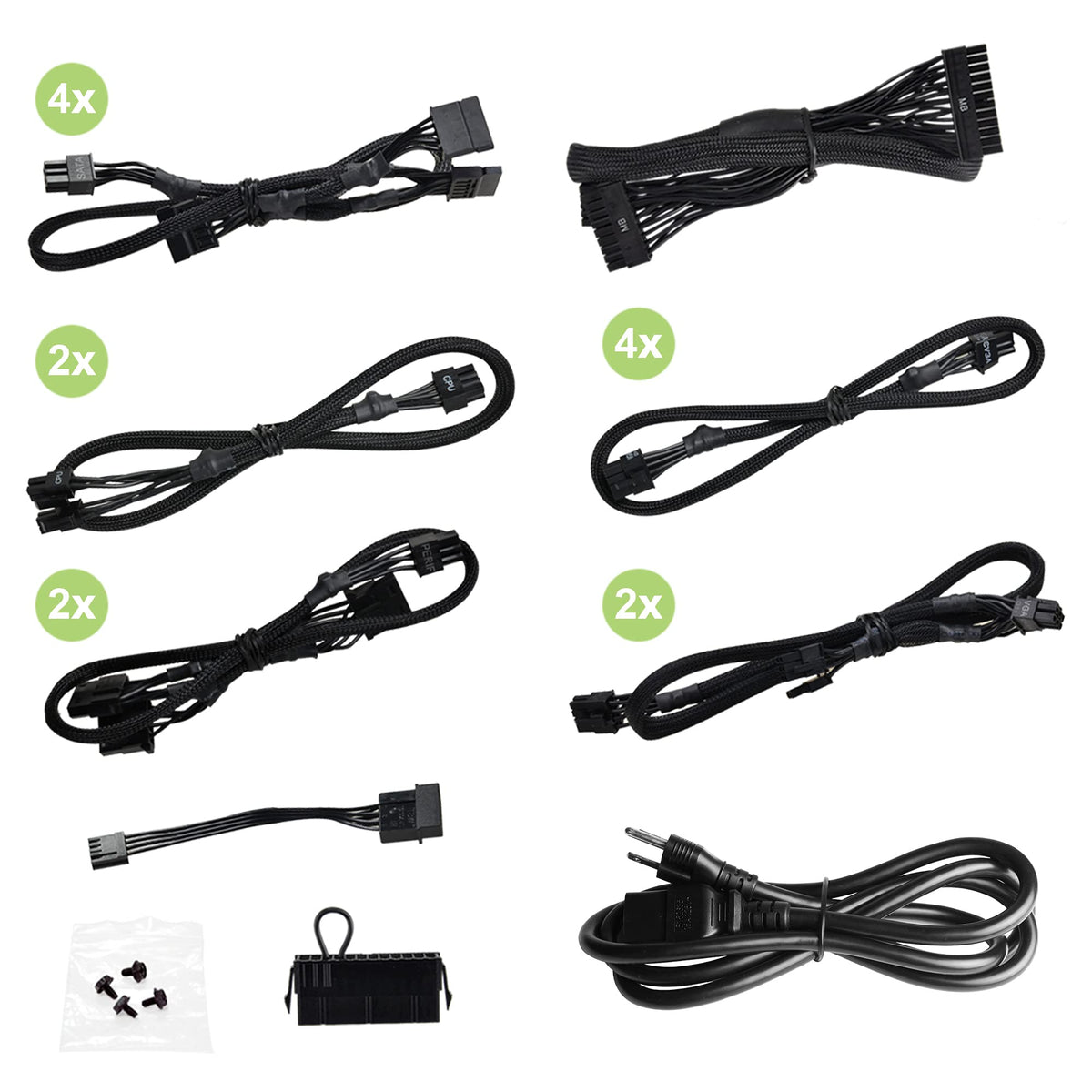 Q: What features enhance the cooling and lifespan of the EVGA Supernova 1300 P+?A: The EVGA Supernova 1300 P+ features a double ball bearing fan and EVGA ECO Mode, which provide ultra-quiet operation and help extend the lifespan of the unit.