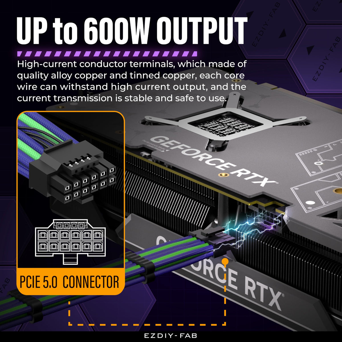 Q: How does the cable management feature work?A: The EZDIY-FAB GPU Power Sleeved Cable Extension includes 4 cable combs that help organize the cables, providing a clean and unified appearance. This feature allows for easy cable management, making your setup look more professional and tidy.