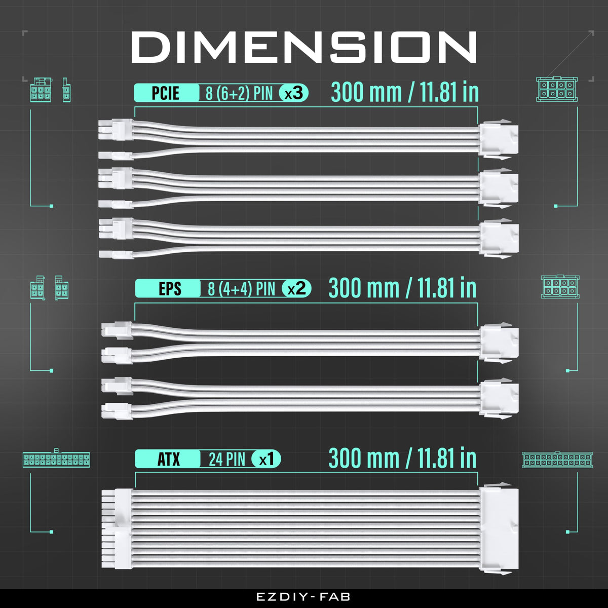 Q: What is the length of the EZDIY-FAB PSU Cable Extension?A: The EZDIY-FAB PSU Cable Extension is 300mm or 11.8 inches long, making it suitable for various PC builds.