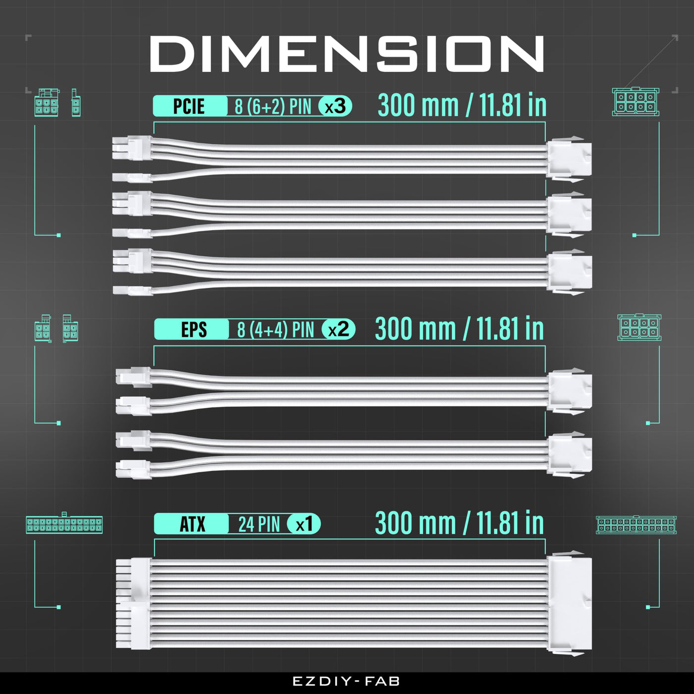 Ezdiy-Fab Psu Cable Extension Sleeved Custom Mod Gpu Pc Power Supply Soft Nylon Braided With Comb Kit 24Pin/3X 8Pin To 6+2Pin/ 2X 8Pin To 4+4Pin-300Mm/11.8In - All White
