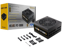 Q: What connectors are included with the HELIOS P2-1000G for GPU support?A: The HELIOS P2-1000G includes a native 16 PIN (12VHPWR) PCIe connector for high-demand GPUs, along with support for a 12+4-pin VGA power connector and up to four 6+2-pin VGA power connectors, making it versatile for various graphics cards.