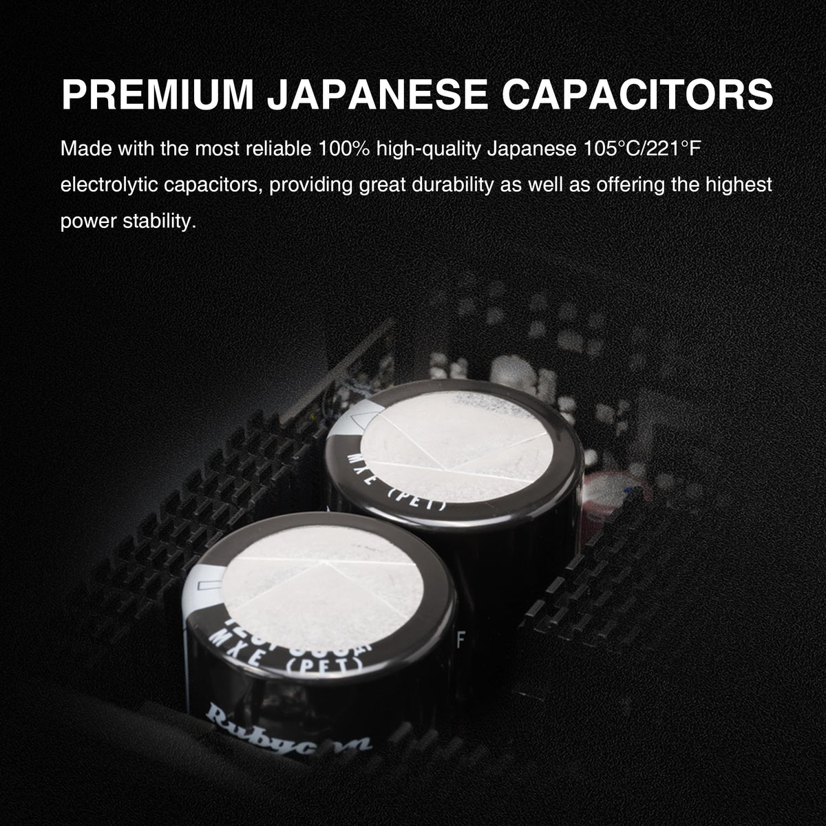 Q: What type of capacitors are used in the GAMDIAS HELIOS P2-1000G?A: The HELIOS P2-1000G is built with 100% high-quality Japanese capacitors rated for 105°C/221°F, ensuring great durability and the highest power stability for your gaming PC.