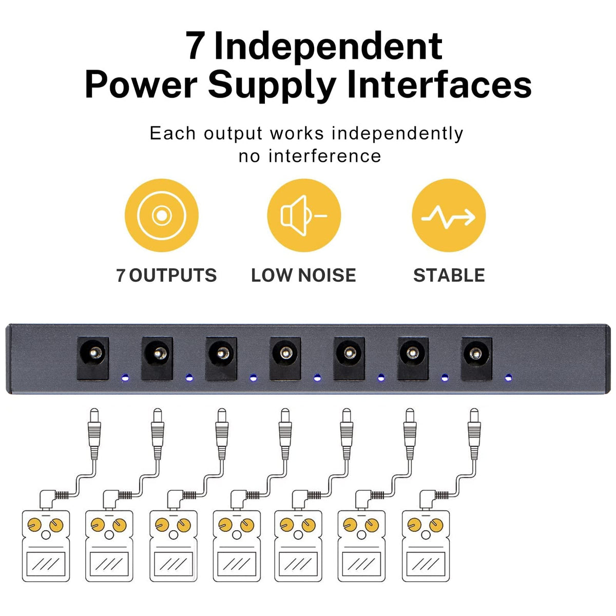 7 Individual Output: A Universal Guitar Power Supply For All Battery-Operated Guitar Pedal Effects.This Guitar Power Supply With Ac 100V-240V Input;6X9V 100Ma Guitar Effects And 1 Adjustable 9V 300Ma, 1 X 5V 1A Usb,The Guitar Pedalboard Power Adapter Is Designed For Effect Pedal | Short Circuit Protection / Overcurrent: 7 Isolated Output Has Short Circuit Protection And Works Independently. A Short Circuit Of One Channel Would Not Affect The Other Channels. | Lower Noise / Heat Dissipation: Built-In Powerful Noise Filter, This Pedal Power Brick Can Greatly Improve The Noise Problem. Using High-Quality Heat-Dissipating Aluminum Alloy Materials, Carefully Selected Ic Chips, Generate Less Heat. And There Is Enough Space Inside The Equipment For Rapid Cooling. | Easy To Use And Carry: Built-In 3.7V/10000Mah Rechargeable Lithium Battery, Over 10 Hours Battery Life Once 6.5 Hours Fully Charged, There Is No Need To Carry A Power Cord, It Is Easy To Use, Plug, And Play. It Also Built-In 1 Usb Dc 5V Charging Port For Iphone, Android, Tablet, And So On. Effect Pedal Power Supply Can Charge Your Devices Anywhere Anytime On Your Side. | Bright Led Lights: This Guitar Power Supply Lighting And Short Circuit Indicating. If You Turn It On, All Leds Would Turn Into Blue Light After The Power Is Connected. The Guitar Pedal Power Supply Also Has The Function Of Lighting When The Power Is Coming On.