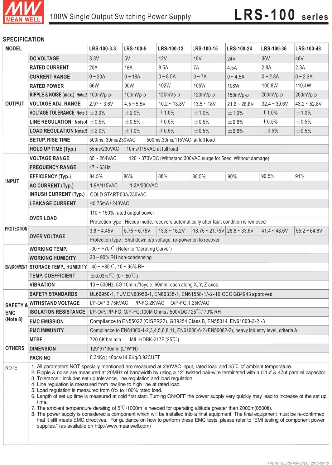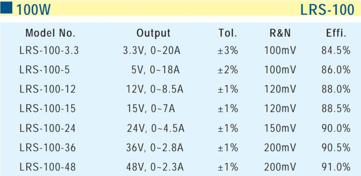 Q: What is the output voltage and current of the Mean Well LRS-100-12?A: The Mean Well LRS-100-12 provides a single output of 12V with a maximum current of 8.5A, delivering a total power output of 102W.