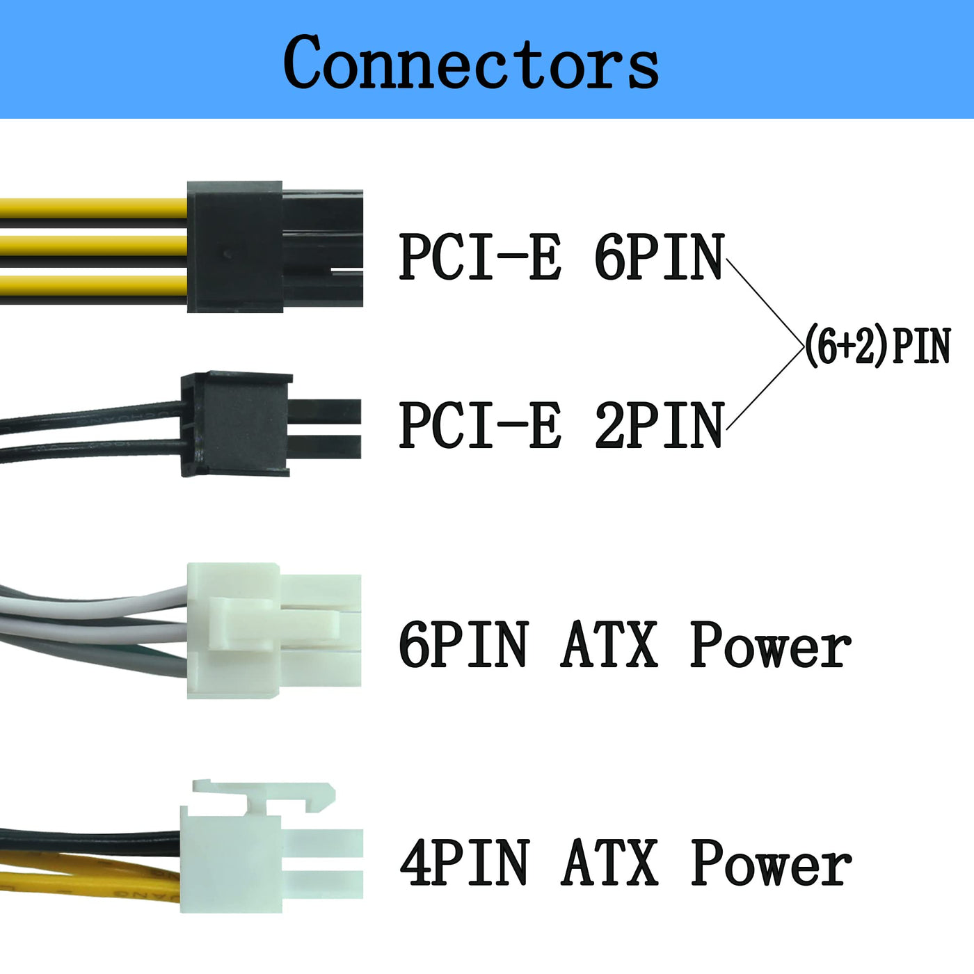 Q: What are the specifications of the Ptcliss 360Watts Power Supply?A: The Ptcliss 360Watts Power Supply features an AC input of 100-240V at 50-60Hz and a maximum DC output of 360W. It includes connectors such as a 6Pin TAX, 4Pin ATX, and a (6+2)pin PCI-E, suitable for 6pin or 8pin video card power supply.