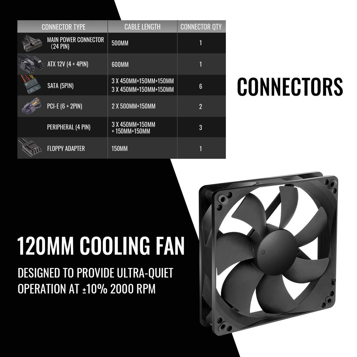 Q: How many connectors does the Toughpower GX2 Power Supply come with?A: The Toughpower GX2 includes various connectors: Main Power (24 pin) x 1, ATX 12V (4+4 pin) x 1, SATA (5 pin) x 6, PCI-E (6+2 pin) x 2, Peripheral (4 pin) x 3, and FDD x 1, providing flexibility for different components.