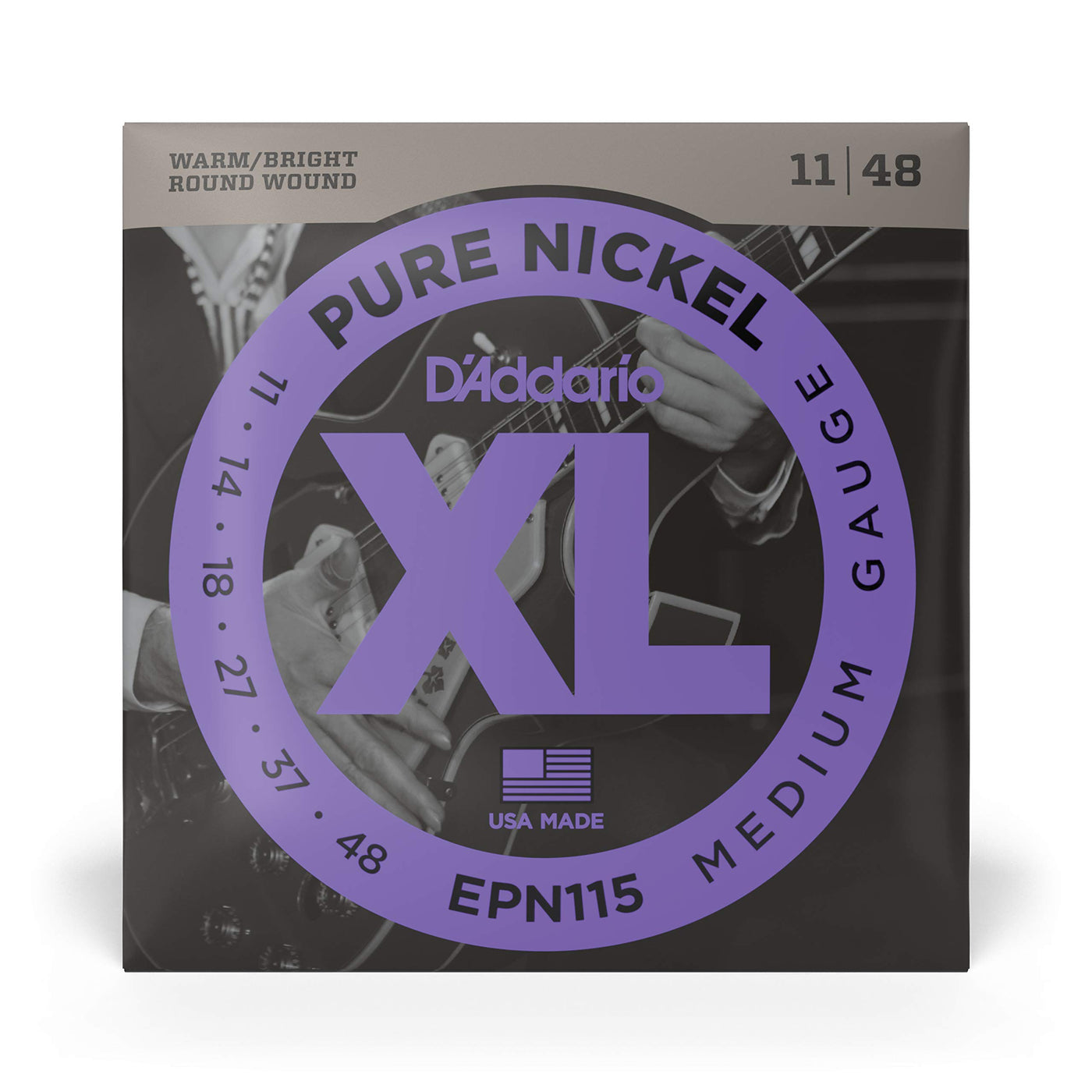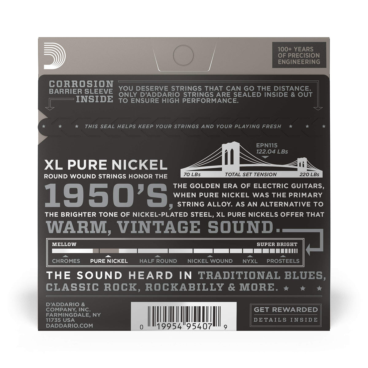 Product Descriptionxl Pure Nickel Is Our Vintage Electric String Set, Designed To Embody The Vibe Of The 50S. In That Early Era Of Electric Guitar, Pure Nickel Was The Main Alloy Used In Electric Guitar Strings. Made With A High Carbon Steel Core And Pure Nickel Wrap Wire, These Electric Strings Revive The Rich, Clean Tones Heard In Early Blues, Rock & Roll, And Country Music. This 11-48 Medium Gauge Set Provides Increased Volume, With Slightly More Tension And Resistance.From The Manufacturerepn115'S Combine The Playability Of D'Addario'S Popular Medium Gauge Set With A Warmer, Vintage Tone.D'Addario Xl Pure Nickel Strings Look Back To The '50S, When Nickel Was The Primary Alloy Found In Electric Guitar Strings. Pure Nickel Strings Would Be Supplanted By Nickelplated Steel In The '60S When Guitarists Required Brighter Tone And Enhanced Magnetism. Pure Nickel Brings Back The Richer, Warmer Timbres Found In Traditional Blues, Classic Rock, Rockabilly, And More.D'Addario, The World'S Largest Manufacturer Of Musical Instrument Strings, Is Known As The Players Choice With A Reputation For Unsurpassed Quality And Consistency. D'Addario'S Innovative Packaging Reduces Waste And Provides Protection From Corrosion. All D'Addario Strings Are Manufactured In The U.S.A. Using Proprietary, Digitally Controlled, State-Of-The-Art Machinery For Unmatched Performance, Set After Set.