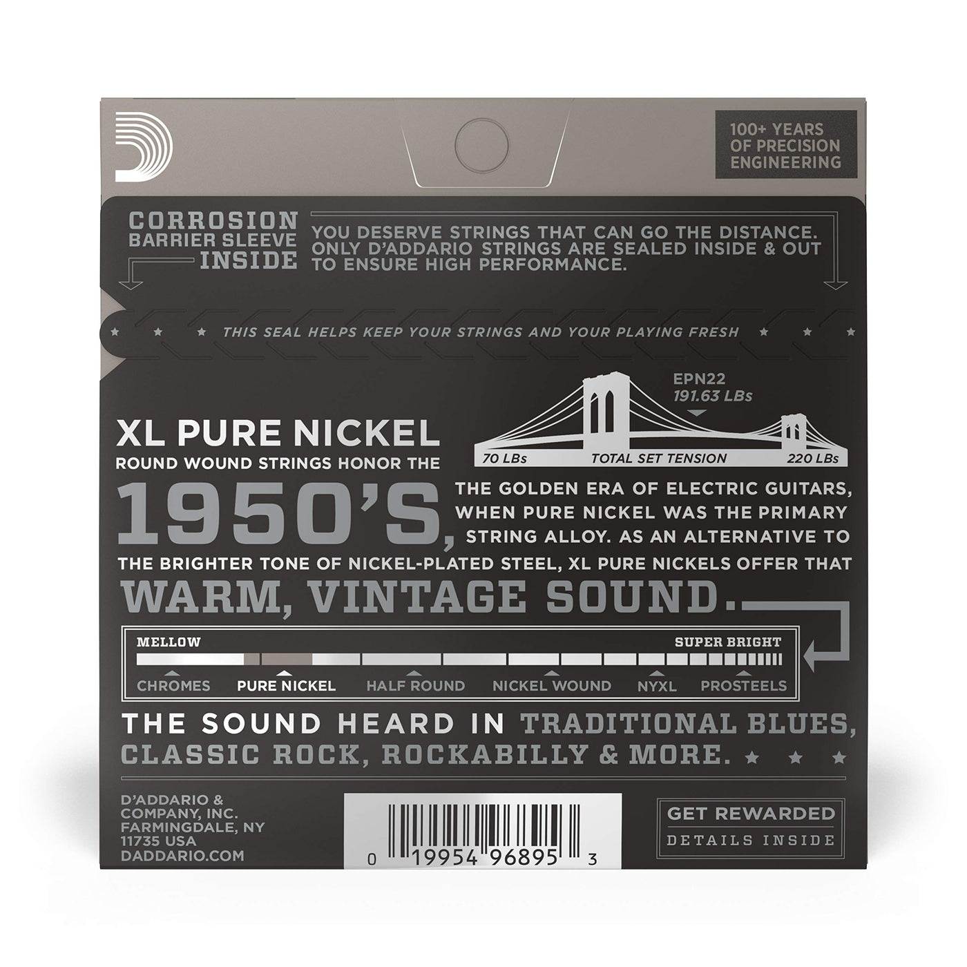 Product Descriptionxl Pure Nickel Is Our Vintage Electric String Set, Designed To Embody The Vibe Of The 50S. In That Early Era Of Electric Guitar, Pure Nickel Was The Main Alloy Used In Electric Guitar Strings. Made With A High Carbon Steel Core And Pure Nickel Wrap Wire, These Electric Strings Revive The Rich, Clean Tones Heard In Early Blues, Rock & Roll, And Country Music. This 13-56 Jazz Medium Set Is Our Heaviest Gauge Of Pure Nickel Strings, Delivering Maximum Tension For The Fullest Tone And Most Resonance.From The Manufacturerepn22'S Combine The Playability Of D'Addario'S Jazz Medium Set With A Warmer, Vintage Tone.D'Addario Xl Pure Nickel Strings Look Back To The '50S, When Nickel Was The Primary Alloy Found In Electric Guitar Strings. Pure Nickel Strings Would Be Supplanted By Nickelplated Steel In The '60S When Guitarists Required Brighter Tone And Enhanced Magnetism. Pure Nickel Brings Back The Richer, Warmer Timbres Found In Traditional Blues, Classic Rock, Rockabilly, And More.D'Addario, The World'S Largest Manufacturer Of Musical Instrument Strings, Is Known As The Players Choice With A Reputation For Unsurpassed Quality And Consistency. D'Addario'S Innovative Packaging Reduces Waste And Provides Protection From Corrosion. All D'Addario Strings Are Manufactured In The U.S.A. Using Proprietary, Digitally Controlled, State-Of-The-Art Machinery For Unmatched Performance, Set After Set.