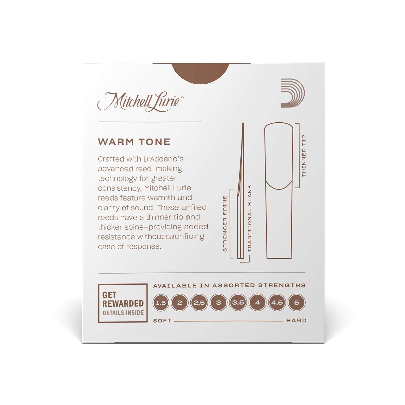 Product Descriptionprofessionals And Students Alike Benefit From The Balance Between Superb Tone And Ease Of Play Of Mitchell Lurie Reeds. Mitchell Lurie Bb Clarinet Reeds Are Available In Boxes Of 10.Premium Grade Cane For Consistent Response And Playabilityslightly Thinner Tip For Ease Of Play And Quick Response And Articulationunfiled For A Deep, Dark Toneat Its San Fernando Valley Facility, Rico Has A State-Of-The-Art Reed Research Center, And Employs The Collaboration Of Agronomists, Scientists, And Musicians To Produce Top-Quality Reeds That Include Rico Reserve Premium Reeds For Clarinet And Saxophone. Rico Reeds Are Designed To Benefit All Levels Of Musicians From The Beginner To The Seasoned Professional. Many Of The Worlds Finest Clarinetists And Saxophonists Use Rico Brand Reeds, Such As Anthony Mcgill, Mark Nuccio, Jessica Phillips, Jerry Bergonzi, Chris Potter, Benny Golson, Ernie Watts, Bob Sheppard, Walter Boeykens, Seiji Yokokawa, Philippe Geiss, Diastema Saxophone Quartet, And Many More. For More Information, Visit Ricoreeds.Comfrom The Manufacturermitchell Lurie Reeds In Strength 4.5 Feature A Thinner Tip For Easy Response Combined With A Medium Spine Thickness For A Warm Sound With Good Resistance.Professionals And Students Alike Benefit From The Balance Between The Superb Tone And Ease Of Play Of Mitchell Lurie Reeds. Mitchell Lurie Bb Clarinet Reeds Are Available In Boxes Of 10.Since The Acquisition Of Rico By Daddario & Co., Rico Has Strengthened Its Position As The Global Leader In Woodwind Reeds And Accessories. Ricos State-Of-The-Art Reed Research Center In Southern California Employs A Collaboration Of Agronomists, Scientists, And Musicians To Produce Top-Quality Reeds, Including Rico Reserve Premium Reeds For Clarinet And Saxophone. Rico Reeds Are Designed To Benefit All Levels Of Musicians, From The Beginner To The Seasoned Professional. Many Of The Worlds Finest Woodwind Players Perform With Rico Reeds, Such As Mark Nuccio, Jerry Bergonzi, Chris Potter, Benny Golson, Ernie Watts, Bob Sheppard, Henri Bok, Richie Hawley, Eric Alexander, And Many More.