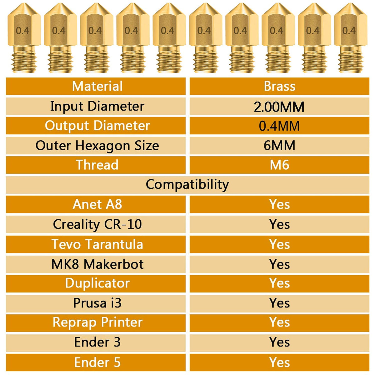 25 Pcs 3D Printer Nozzle Mk8 Extruder Brass Head With Free Metal Storage Boxspecification:Color: Goldmaterial: Brassoutput Diameter: 0.4 Mminput Diameter: 2.0 Mmscrew Thread: M6Hexagon Diameter: 6 Mmquantity: 25Pcsprinter Nozzle Cleaning Kit:5 Pcs Stainless Steel Needle(With Storage Box)Compatibility: Anet A8, Creality Cr-10, Tevo Tarantula, Mk8 Makerbot, Duplicator, Prusa I3 And Reprap Printerpackage Includes:25 X Brass 0.4Mm Nozzle5 X Stainless Steel Needle1 X Plastic Container For Needle1 X Metal Storage Boxwarm Note:?After Replacing The Nozzle, Please Re-Calibrate The Distance Between Nozzle And Build Plate To Ensure The Quality Of Print Parts.?Small Parts, Please Keep Them Away From Children.