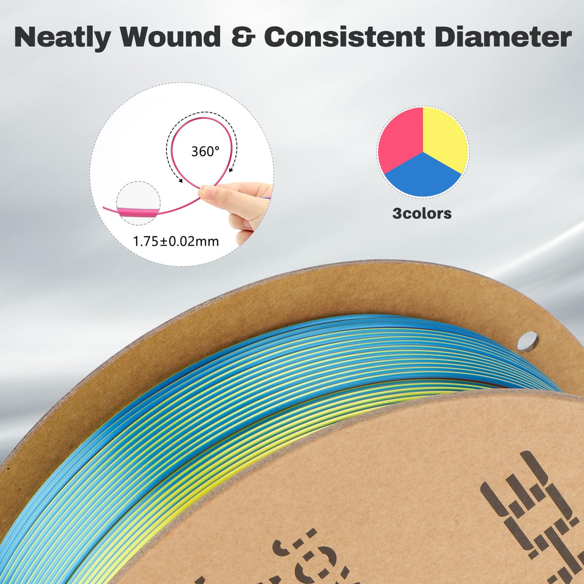 Q: Can I achieve a smooth and shiny finish with this filament?A: Absolutely! The Silk PLA formulation provides a smooth and shiny surface finish for your prints, enhancing their visual appeal. The unique color pattern created by the triple color combination also adds a distinctive effect to each print.