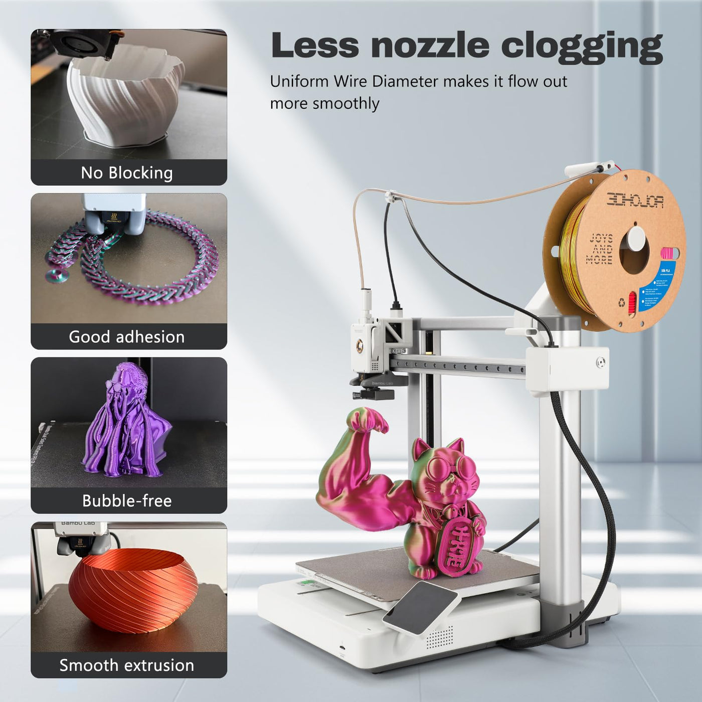 Q: Is this filament compatible with my 3D printer?A: Yes, 3DHoJor Silk PLA Filament is designed to work perfectly with most fast-printing FDM 3D printers on the market, including popular models like Bambu Lab A1 mini, AnkerMake M5, and Creality Ender series.