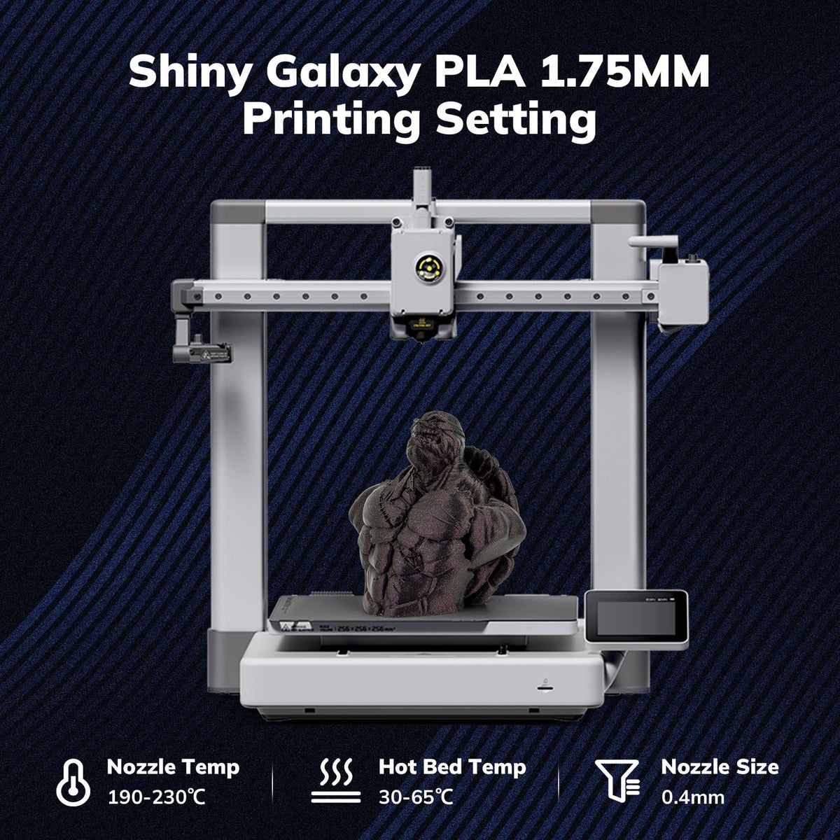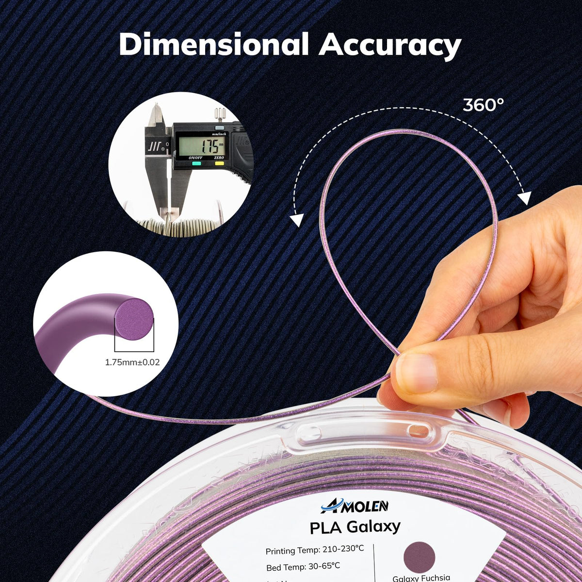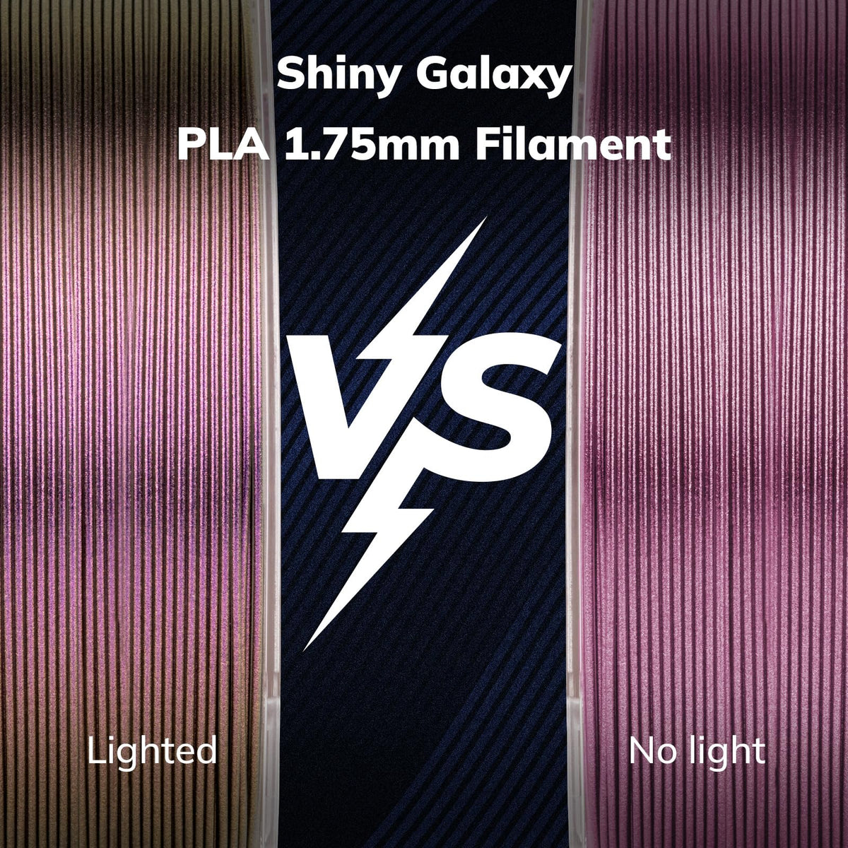 Q: How does the color-changing feature of the Galaxy Fuchsia filament work?A: The Galaxy Fuchsia filament features specialized color-changing powder materials that react to different light angles. This means that the filament can appear blue when viewed from one angle and purple from another, creating an eye-catching effect on your prints.