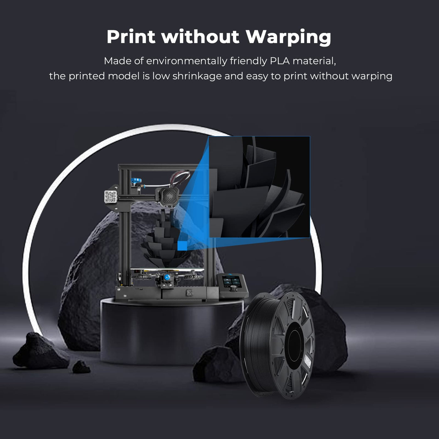 Q: Does this filament produce warping during printing?A: No, the Creality PLA filament is designed to print without warping, thanks to its low shrinkage properties and environmentally friendly PLA material.