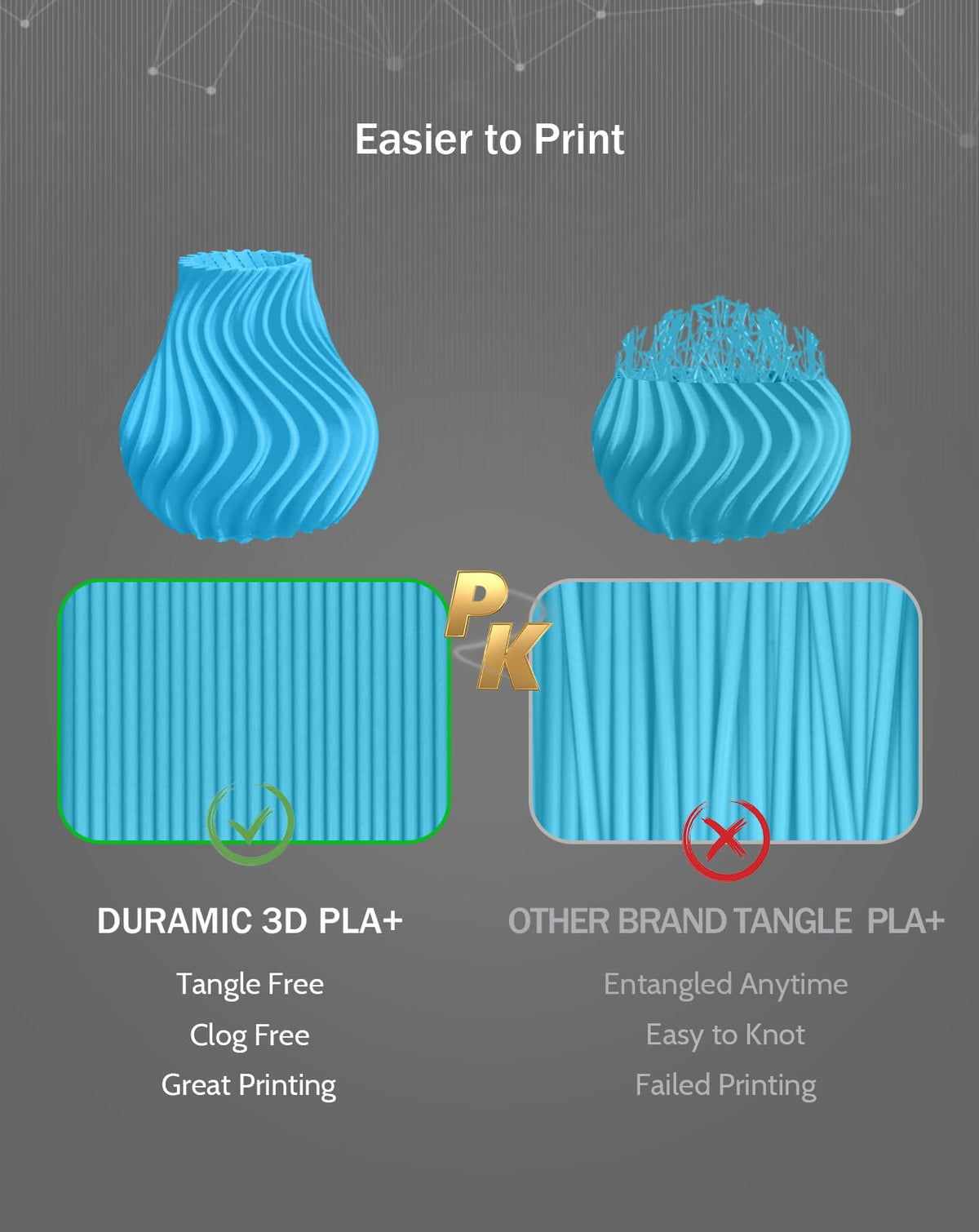 Duramic 3D, Your Trustworthy Cost-Effective Go-To Filaments Brand!Whats Duramic 3Ds Guarantee? Duramic 3D Guarantees You Risk-Free Purchase, Youll Get One-Month Free Trial, Lifetime Quality Promise And Money-Back Service If Youre Not 100% Satisfied, Along With Professional Troubleshooting From Technique Support Team. You Can Contact Us Anytime If You Have Any Issues Or Questions. Important Notice: Duramic 3D Plans To Switch Gradually From Plastic Spools To Cardboard Spools, In Order To Better Protect The Environment. The Cardboard Spool Is Made Of Compressed Recycled Paper, Which Is A Scientific Reuse Of Recycled Resources. Besides, The Paper Spool, Along With The Paper Sticker, Is Easily For Sorting And Recycling Itself. The Filaments Remain The Same Formula And Quality As Before. Pla Plus, Tougher Pla Duramic 3D Pla Plus Printing Filaments Are Advanced Pla Plus Produced With Raw Materials From Natureworks, Which Is The Top Pla Supplier In The World. Compared To Ordinary Pla, Duramic Pla+ Filaments Delivers 8 Times Improved Mechanical Properties And Printing Quality, But At The Same Price Level.Specifications: Net Weight Of Filaments: 1 Kg(2.2 Lbs) Diameter: 1.75 Mm+/- 0.05 Tolerance: 100% 0.05Mm, 99.9% 0.04Mm, 99% 0.03Mm And 97% 0.02Mm Recommended Nozzle Temp: 22010C (410? - 446?) Heated Bed Temp: 25C - 60C (77? - 140?) Printing Speed: 40-80Mm/Stips: 1. Please Put The End Of The Filament Tightly Into The Storage Holes To Prevent Tangling Issues Due To Loose Or Bouncing Spool. 2. Please Seal The Unfinished Spool In The Resealable Bag With Desiccant To Avoid Humidity. 3. Please Make Sure Your Build Plate Is Properly Levelled Before Printing.