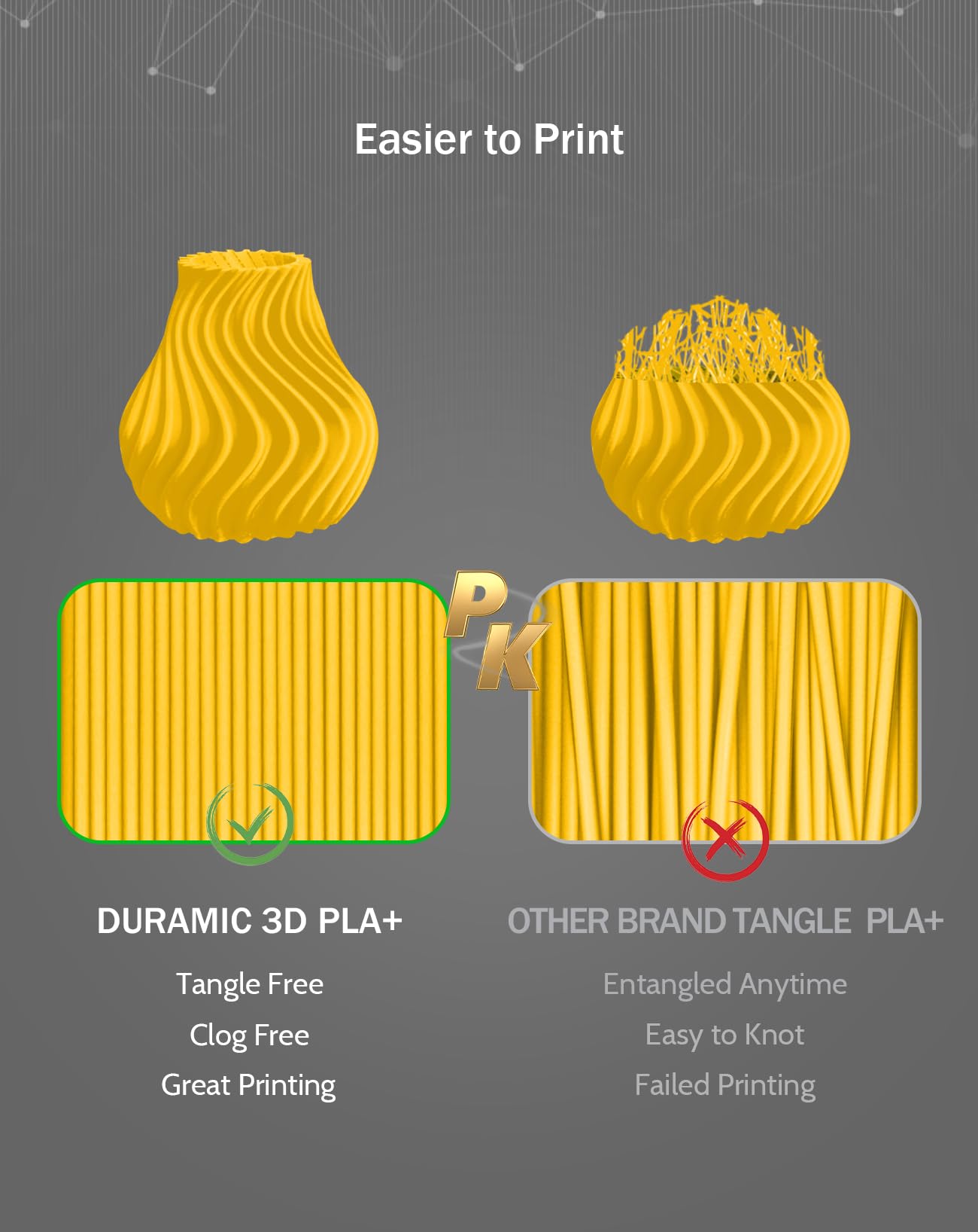 'Duramic 3D, Your Trustworthy Cost-Effective Go-To Filaments Brand!Whats Duramic 3Ds Guarantee? Duramic 3D Guarantees You Risk-Free Purchase, Youll Get One-Month Free Trial, Lifetime Quality Promise And Money-Back Service If Youre Not 100% Satisfied, Along With Professional Troubleshooting From Technique Support Team. You Can Contact Us Anytime If You Have Any Issues Or Questions. Important Notice: Duramic 3D Plans To Switch Gradually From Plastic Spools To Cardboard Spools, In Order To Better Protect The Environment. The Cardboard Spool Is Made Of Compressed Recycled Paper, Which Is A Scientific Reuse Of Recycled Resources. Besides, The Paper Spool, Along With The Paper Sticker, Is Easily For Sorting And Recycling Itself. The Filaments Remain The Same Formula And Quality As Before. Pla Plus, Tougher Pla Duramic 3D Pla Plus Printing Filaments Are Advanced Pla Plus Produced With Raw Materials From Natureworks, Which Is The Top Pla Supplier In The World. Compared To Ordinary Pla, Duramic Pla+ Filaments Delivers 8 Times Improved Mechanical Properties And Printing Quality, But At The Same Price Level.Specifications: Net Weight Of Filaments: 1 Kg(2.2 Lbs) Diameter: 1.75 Mm+/- 0.05 Tolerance: 100% 0.05Mm, 99.9% 0.04Mm, 99% 0.03Mm And 97% 0.02Mm Recommended Nozzle Temp: 22010C (410? - 446?) Heated Bed Temp: 25C - 60C (77? - 140?) Printing Speed: 40-80Mm/Stips: 1. Please Put The End Of The Filament Tightly Into The Storage Holes To Prevent Tangling Issues Due To Loose Or Bouncing Spool. 2. Please Seal The Unfinished Spool In The Resealable Bag With Desiccant To Avoid Humidity. 3. Please Make Sure Your Build Plate Is Properly Levelled Before Printing. ''