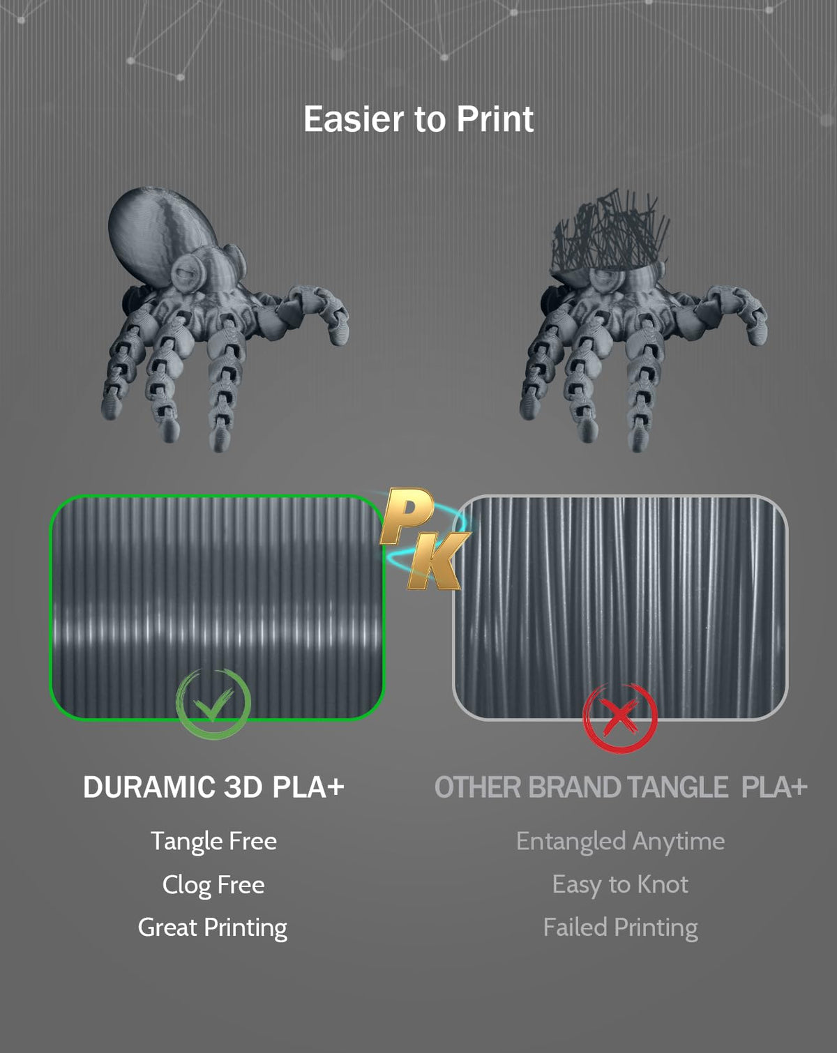 Q: What are the benefits of using Duramic 3D PLA Plus over standard PLA?A: Duramic 3D PLA Plus offers enhanced features compared to standard PLA, including 8 times impact strength, improved layer adhesion, and reduced risk of clogging due to its jam-free technology. This makes it ideal for printing functional and durable models.
