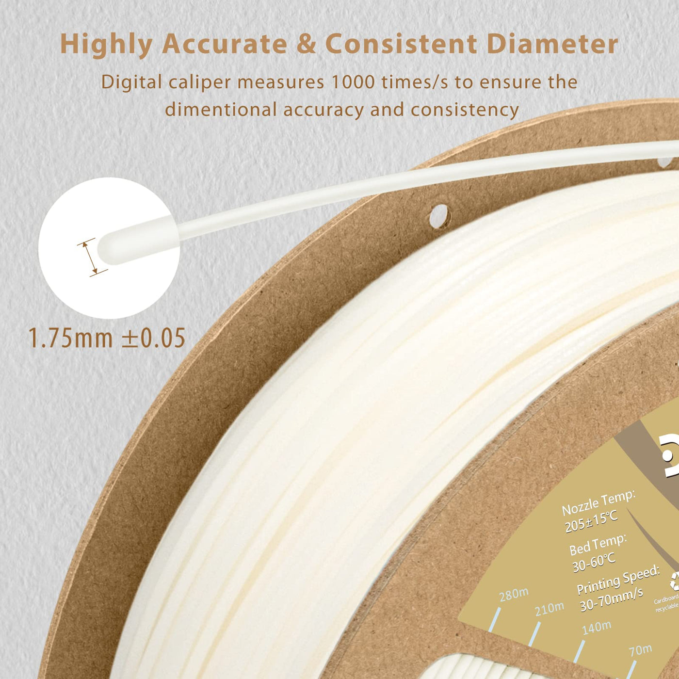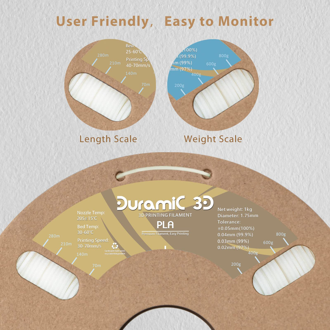 Give Us A Chance To Prove Duramic 3D Is Your New Go-To 3D Filaments Brand! Supported By Manufacturer With Years Of Research And Innovation In 3D Printing Technology In Different Industries, Duramic 3D Is Dedicated To Offer Our 3D Printer Filaments With Consistent And Stable Performance. Duramic 3D Pla Printing Filaments Are Produced With Nano-Reinforcement Technology And Raw Materials From Natureworks, Which Is The Top Pla Supplier In The World. We Promise Never Use Recycled Material To Ensure Its Consistent Printing Performance. Notice: 1. Please Put The End Of The Filament Tightly Into The Storage Holes To Prevent Tangling Issues Due To Loose Or Bouncing Spool. 2. Please Seal The Unfinished Spool In The Resealable Bag With Desiccant To Avoid Humidity, Which Will Prevent Your Spool From Being Brittle. 3. You Can Check The Length Scale And Weight Scale To Monitor The Remaining Length And Weight Roughly. 4. Different 3D Printers May Need Different Settings. We Recommend You To Print A Draft To Test The Optimal Settings And Adhesion First Before Printing Your Actual Work. Specifications Filaments Net Weight: 1 Kg (2.2 Lbs) Filaments Diameter And Accuracy: 1.75 Mm +/- 0.05 Recommended Extrusion/Nozzle Temp: 22010C (410? - 446?) Heated Bed Temp: 25C - 60C (77? - 140?) Printing Speed: 40-80Mm/S What You Get: 1 X Spool Of Pla Filament 1-Month Free Trial, Lifetime Warranty, Money-Back Guarantee