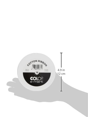 Q: What is the width and length of the e-Mark COLOP Cotton Ribbon?A: The e-Mark COLOP Cotton Ribbon measures 15 mm in width and 25 m in length, which is approximately 0.59 inches wide and 82 feet long.