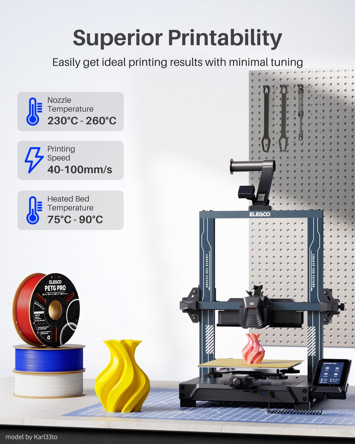 Q: How does ELEGOO PETG PRO filament differ from regular PETG?A: ELEGOO PETG PRO filament offers enhanced durability and toughness compared to regular PETG, providing superior resistance to water, UV, and temperature, making it ideal for outdoor applications.