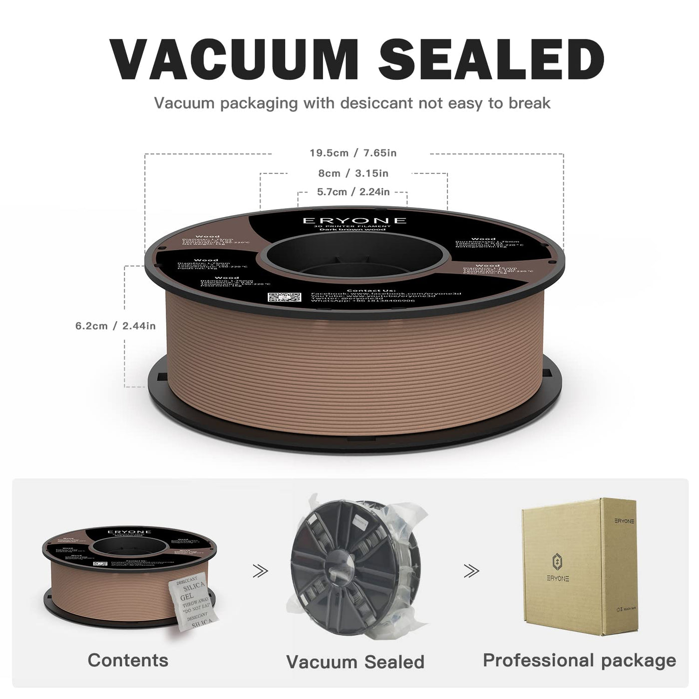 Q: How is the ERYONE PLA filament packaged to ensure quality?A: The filament comes in a sealed vacuum bag with a desiccant to keep it dry and free from dust and foreign matter, ensuring it remains 100% tangle-free before being opened.
