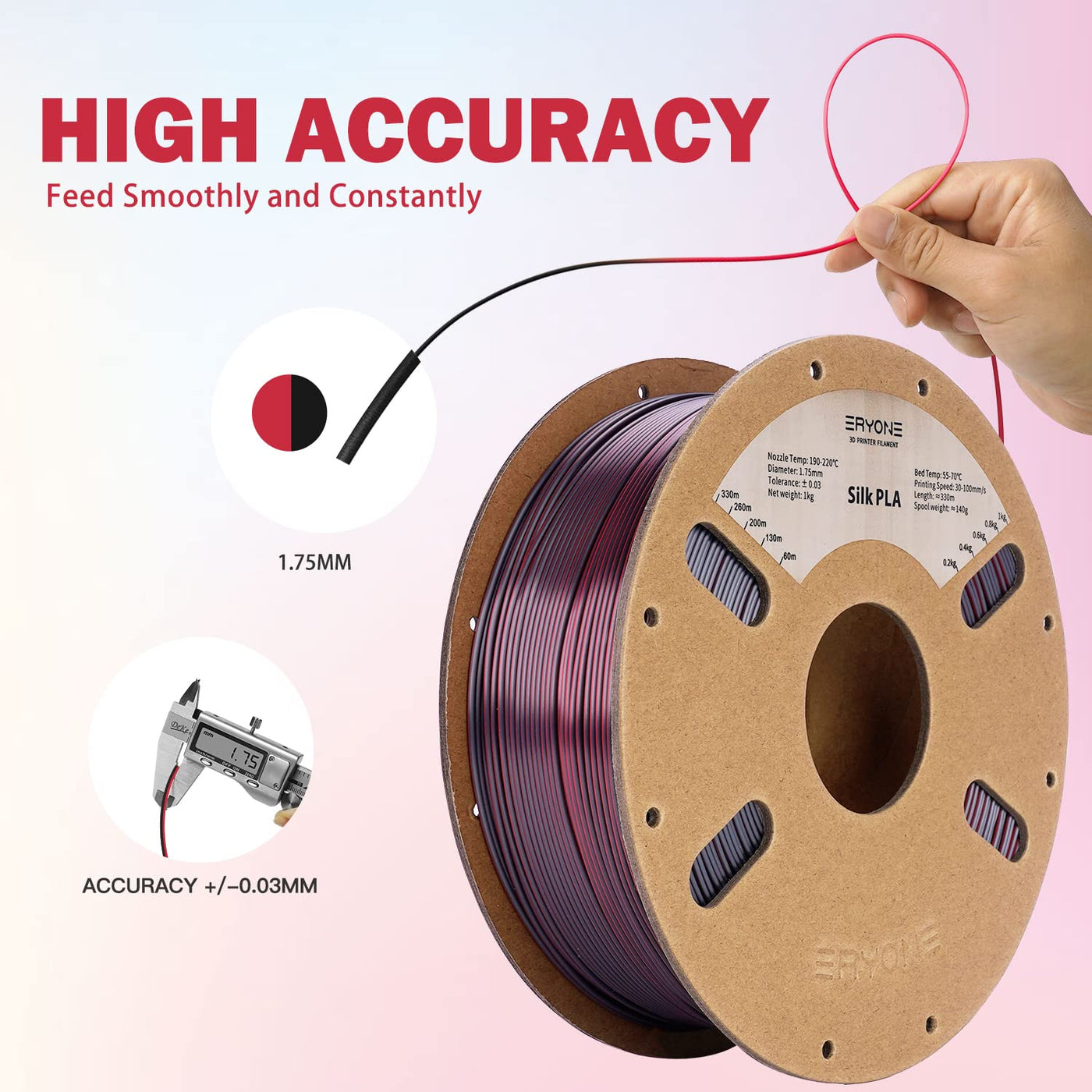 Q: What is the recommended printing temperature for the ERYONE Silk Dual Color PLA filament?A: The recommended printing temperature for the ERYONE Silk Dual Color PLA filament is between 180°C and 210°C. For remote printers, it is advisable to set the temperature at 190-210°C, while for proximity printers, a range of 180-200°C is suggested.