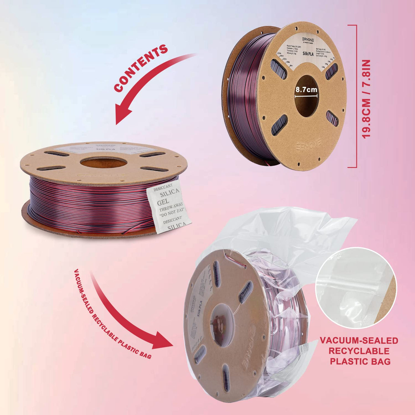 Q: How should I store the ERYONE Silk Dual Color PLA filament?A: To ensure the longevity and quality of the ERYONE Silk Dual Color PLA filament, it should be stored in its original reusable vacuum-sealed packaging with the built-in desiccant, away from moisture and direct sunlight.