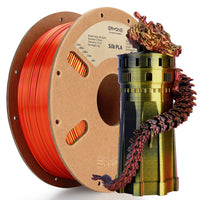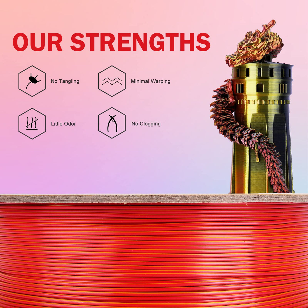 Q: What are the unique features of the Silk Tri Color PLA Filament?A: This filament features a shiny silk finish that eliminates the need for extra polishing, provides strong layer adhesion to reduce warping and print failures, and is designed to be tangle-free and easy to use.
