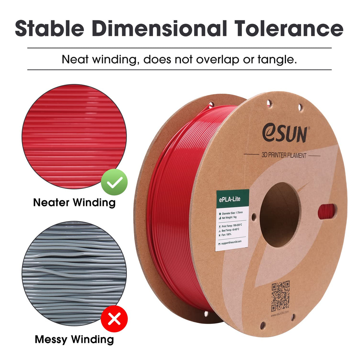Q: How does eSUN PLA Filament prevent tangling and clogging during printing?A: The filament features perfect roundness and tight diameter tolerance, which minimizes the risk of tangling. It is wound carefully to avoid overlaps, and it melts smoothly, reducing the chances of clogging in the nozzle or extruder, leading to a high successful printing rate.