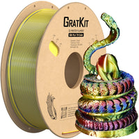 Q: What is Gratkit Silk Tri-Color PLA Filament?A: Gratkit Silk Tri-Color PLA Filament is a 3D printing filament made from Polylactic Acid (PLA) that features a unique tri-color effect, showcasing red, yellow, and blue colors in one strand. It is designed for creating eye-catching prints with a shiny silk finish.