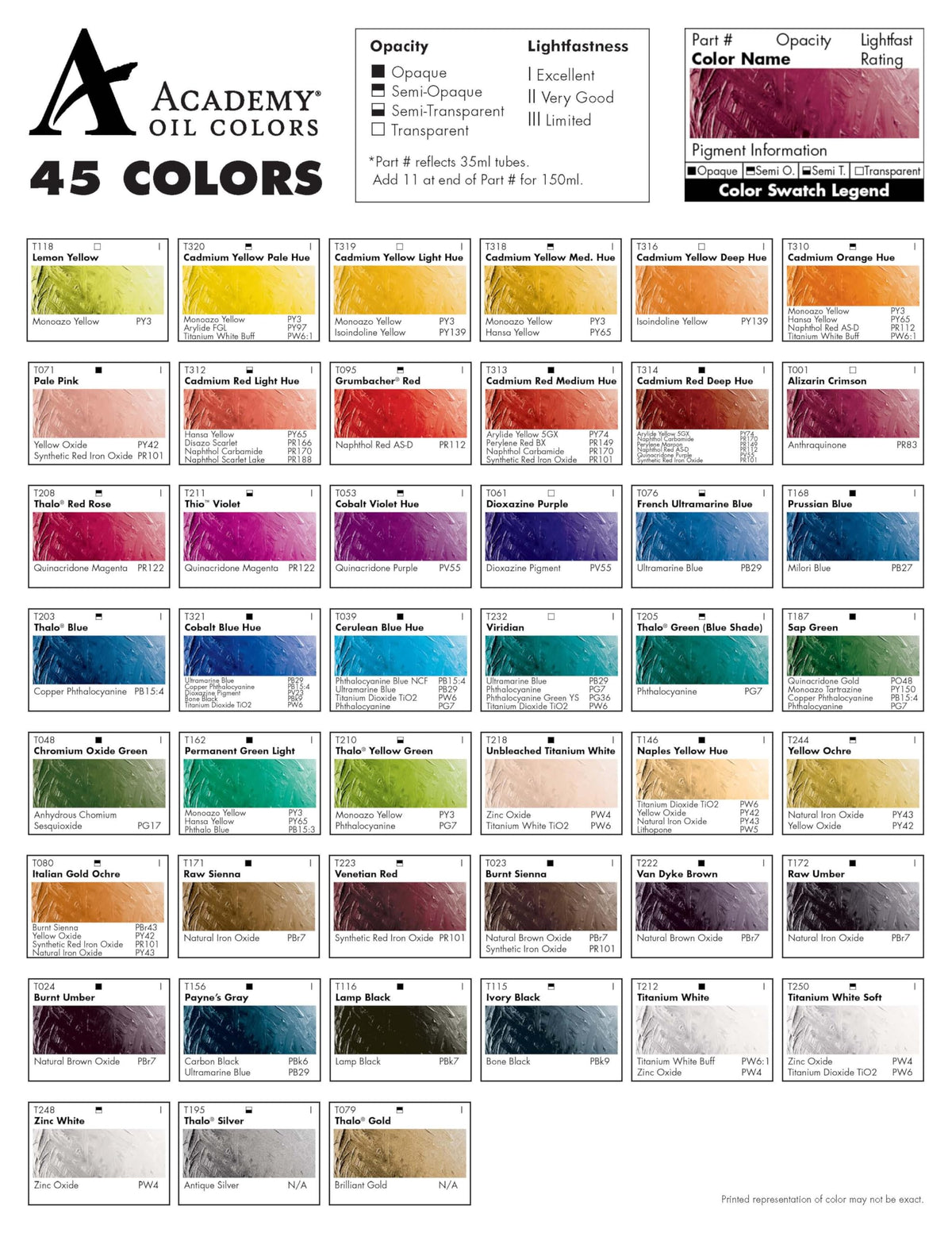 Grumbacher Academy Oils Provide A Full Range Of Traditional Oil Colors For The Painter Who Demands Good Quality Materials, But Also Appreciates Good Prices. The Academy Colors Include Genuine Pigment Colors As Well As Mixed Hues. All Colors Have Excellent Tinting Strength, And The Whites Are Absolutely Non-Yellowing. All Colors Are Available In 1.25 Oz (37 Ml) Studio Size Tubes. Now You Can Afford To Experiment More Extravagantly! Purchase The Colors You Use The Most In Economical 5 Oz (150 Ml) Tubes And Save Even More!