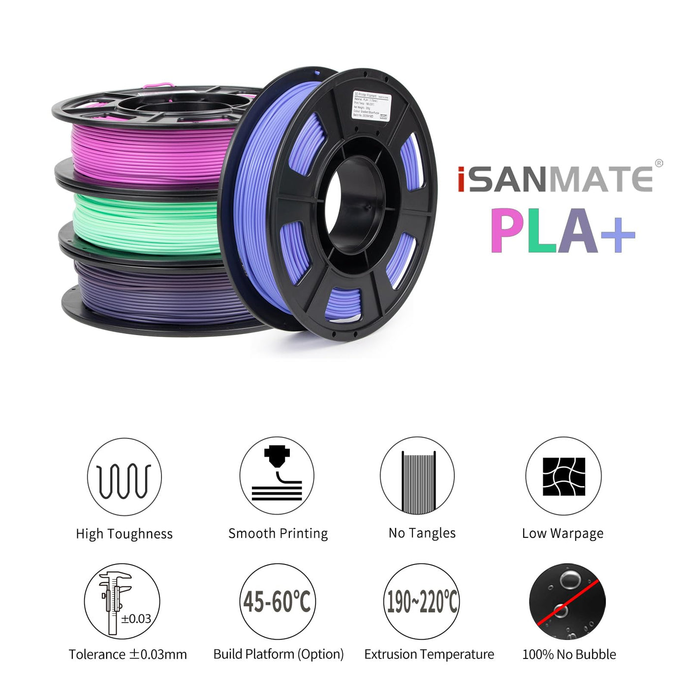 Q: What are the recommended printing temperatures for iSANMATE PLA+ filament?A: The recommended printing temperature for iSANMATE PLA+ filament is 200℃, with a range from 190 to 220℃.