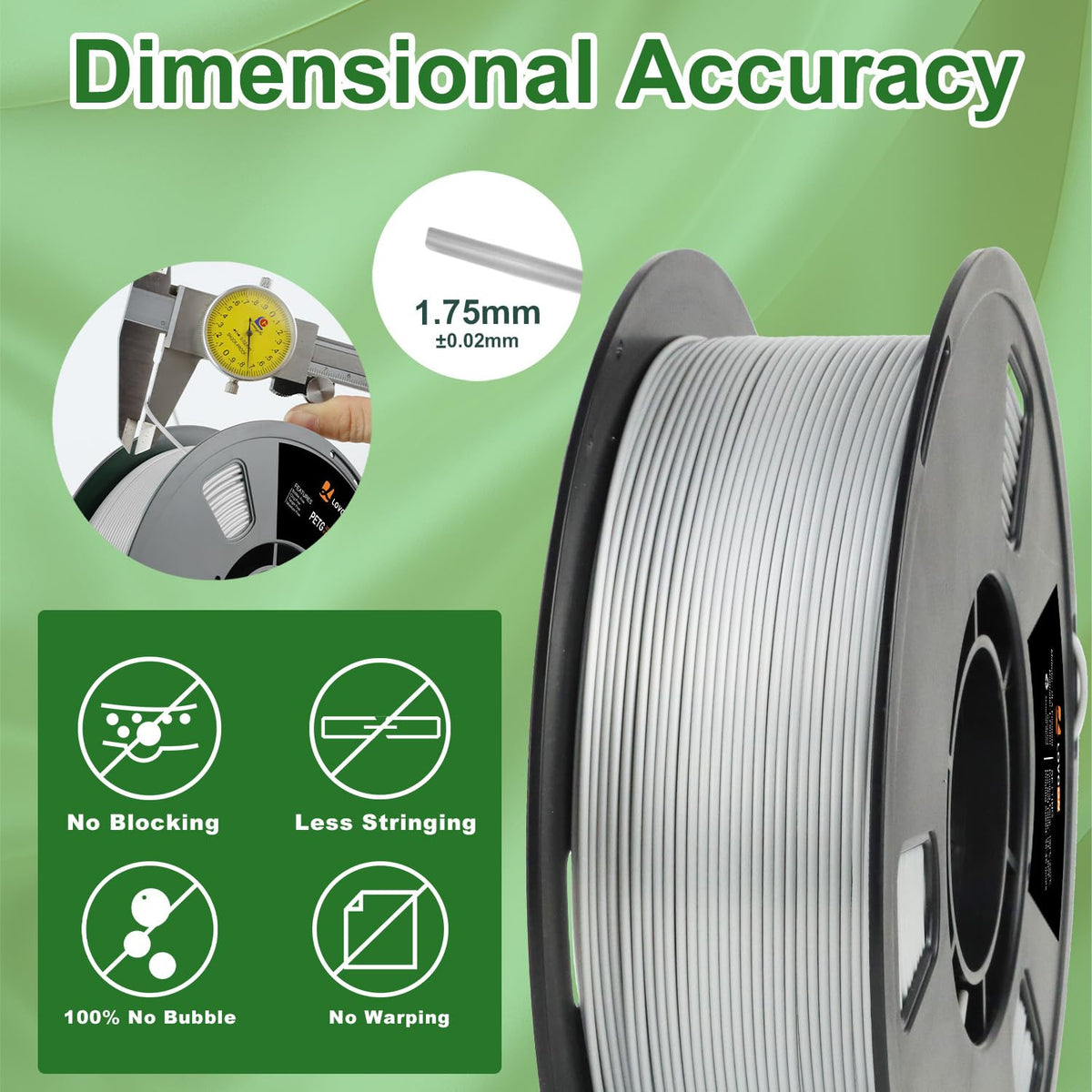 Q: What is the dimensional accuracy of LOVOON Silk Silver PLA filament?A: The dimensional accuracy of LOVOON Silk Silver PLA filament is +/- 0.02mm, which helps ensure a reliable and consistent printing experience without issues like jamming or tangling.