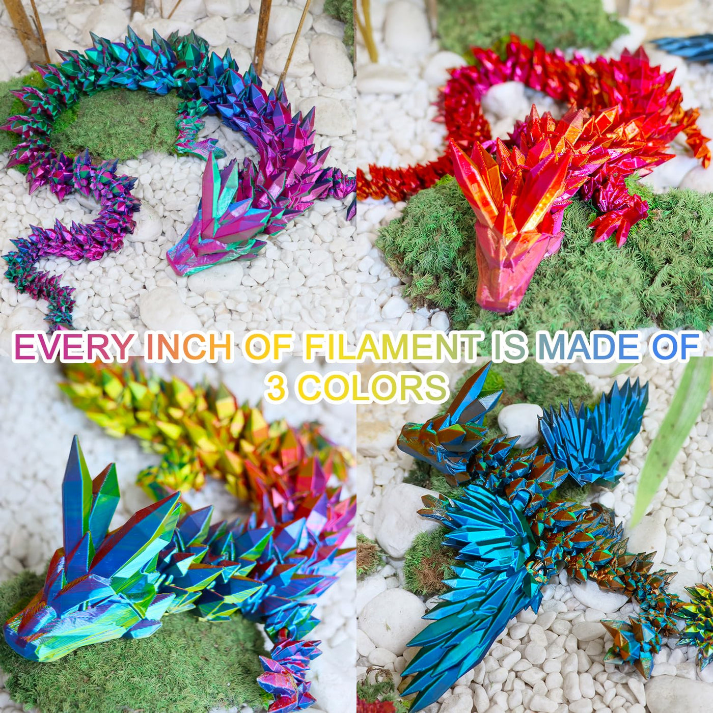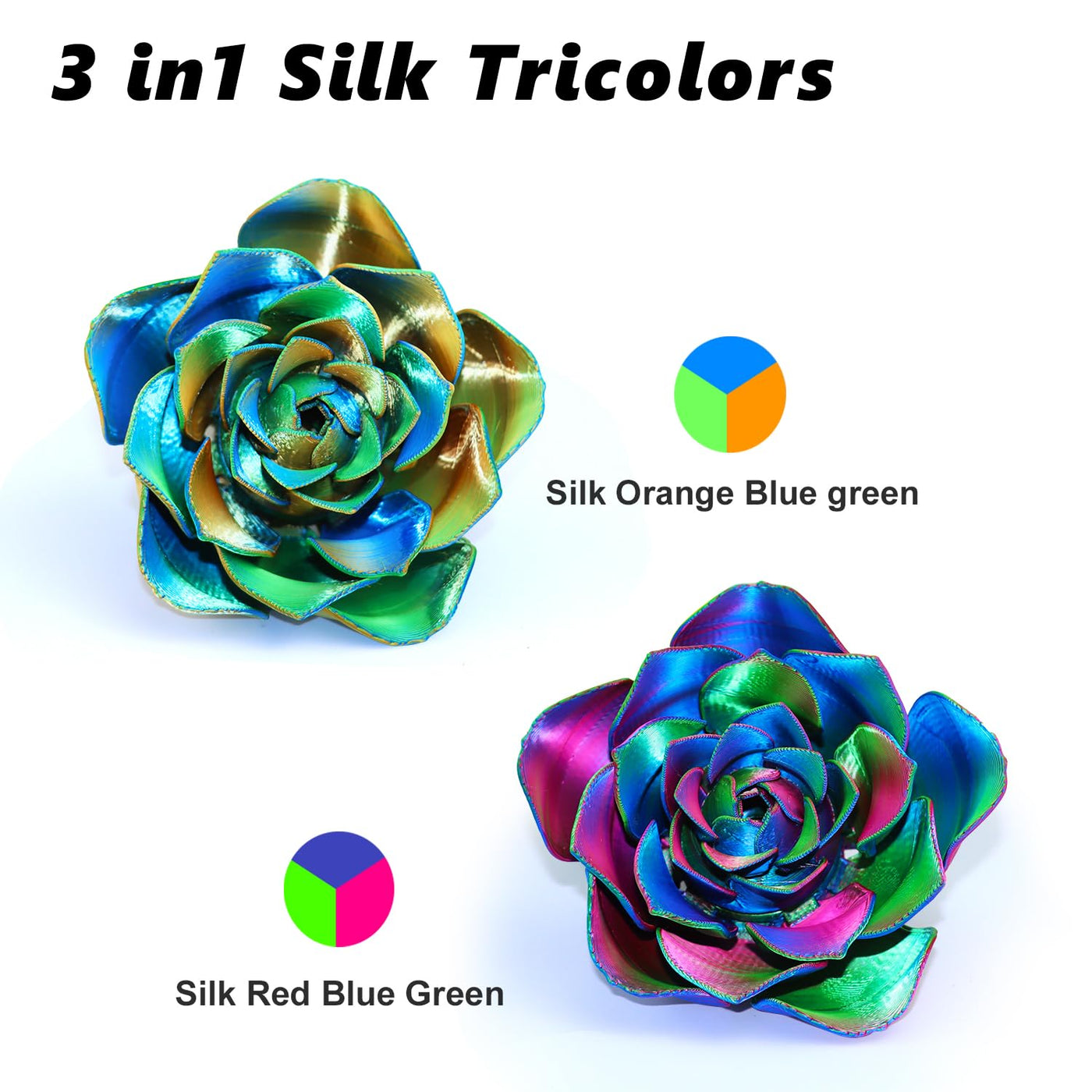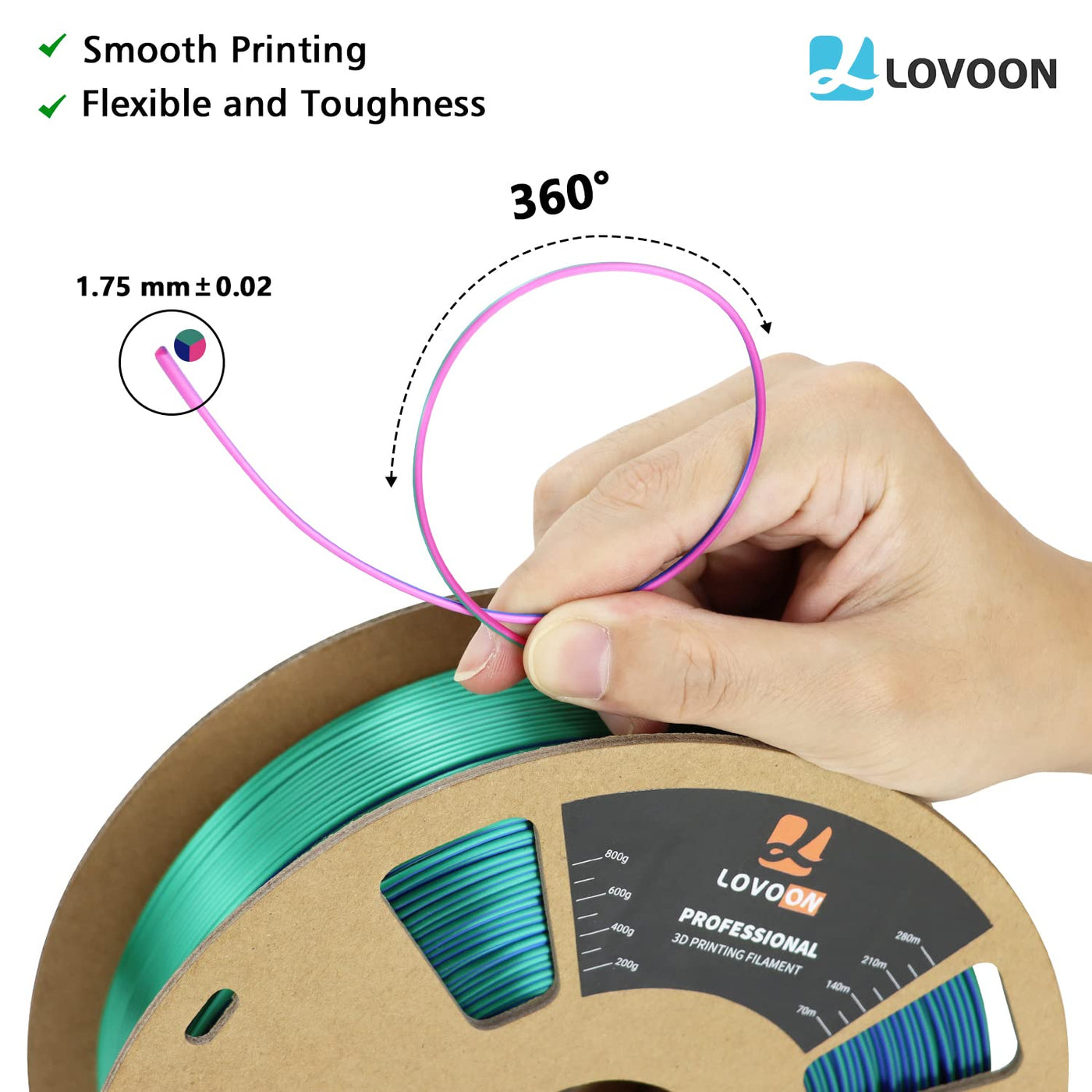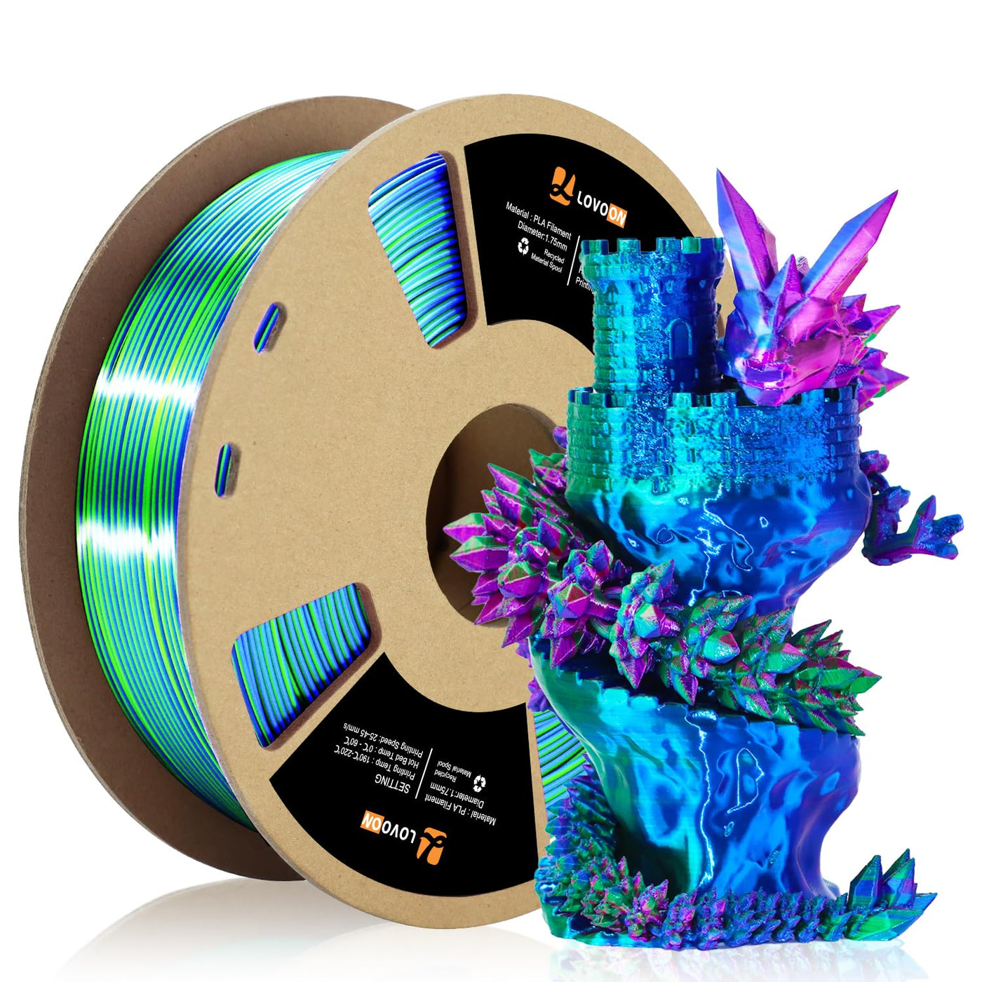 Q: How does the tricolor feature of this filament work?A: The tricolor design of the LOVOON filament is achieved through coextrusion, allowing it to combine distinct colors—red, blue, and green—into a single filament. This results in vibrant, multi-colored prints regardless of the project's size.