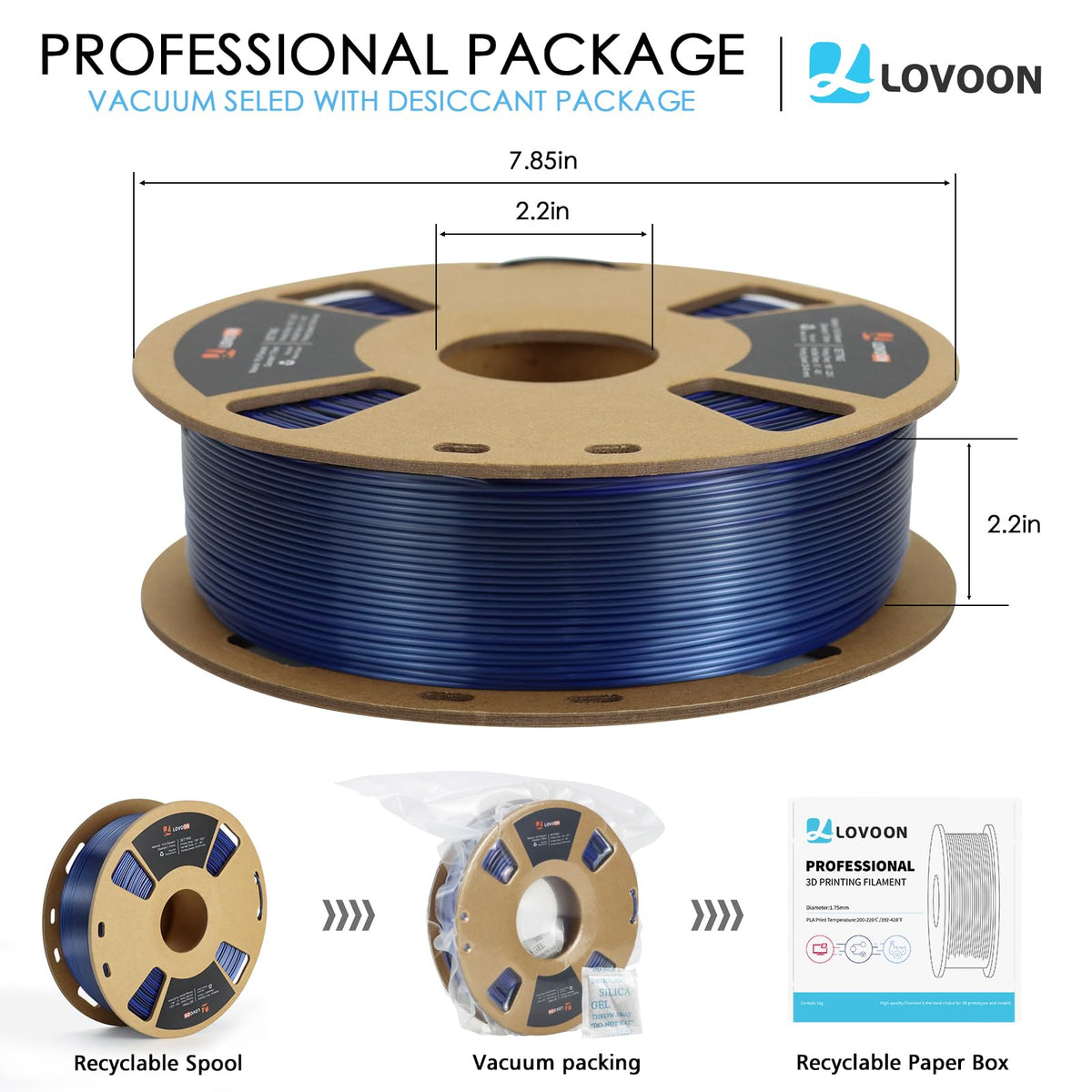 Q: What should I do to prevent moisture damage to the filament?A: To protect LOVOON filament from moisture, it comes vacuum sealed with desiccants after being completely dried for 24 hours before packaging. It is advisable to store the filament in a cool, dry place and reseal it after use to maintain its quality.