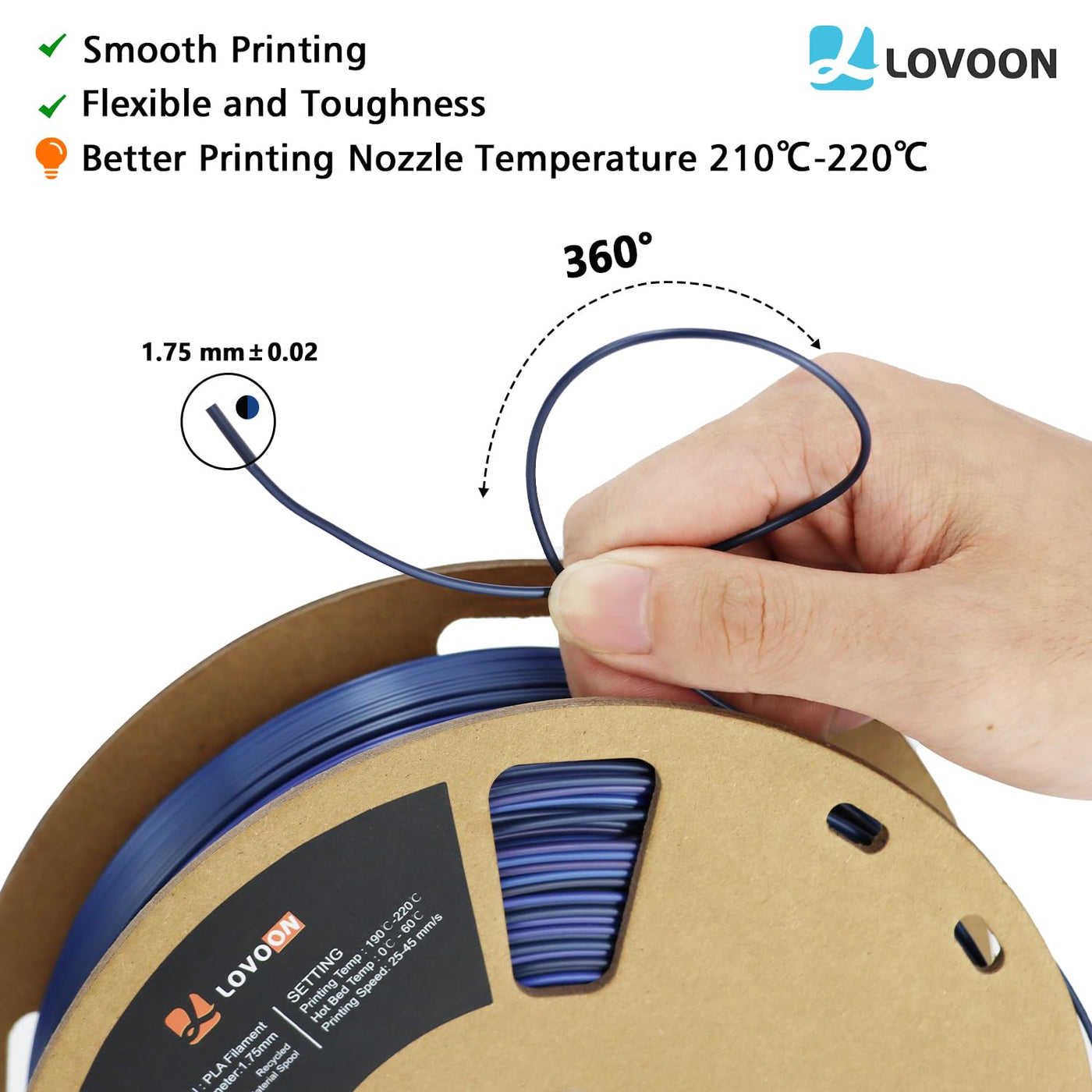 Q: How does the color shift feature work in this PLA filament?A: The LOVOON color shift PLA filament features a unique gradient that changes colors naturally every 10 meters. This allows for the creation of visually stunning prints that showcase a blend of black, blue, and purple hues, enhancing the aesthetic appeal of your 3D projects.