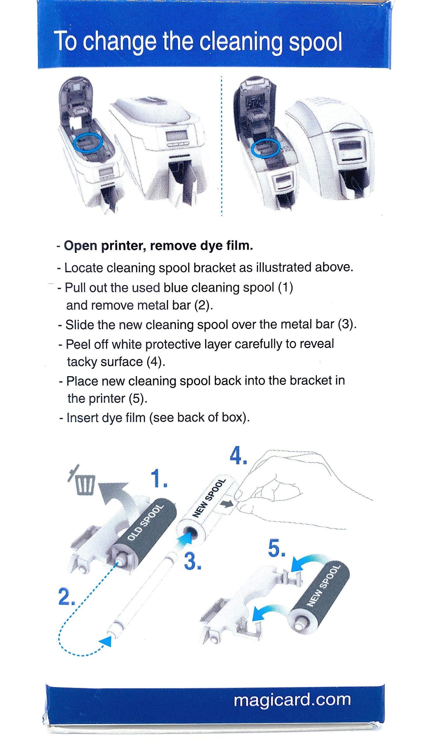 Q: What are the features of the Magicard MA300YMCKO ribbon?A: This ribbon features a full-color 5-panel YMCKO dye film, an individual cleaning roller included in the packaging, and a drop-in dye film loading system for hassle-free installation.