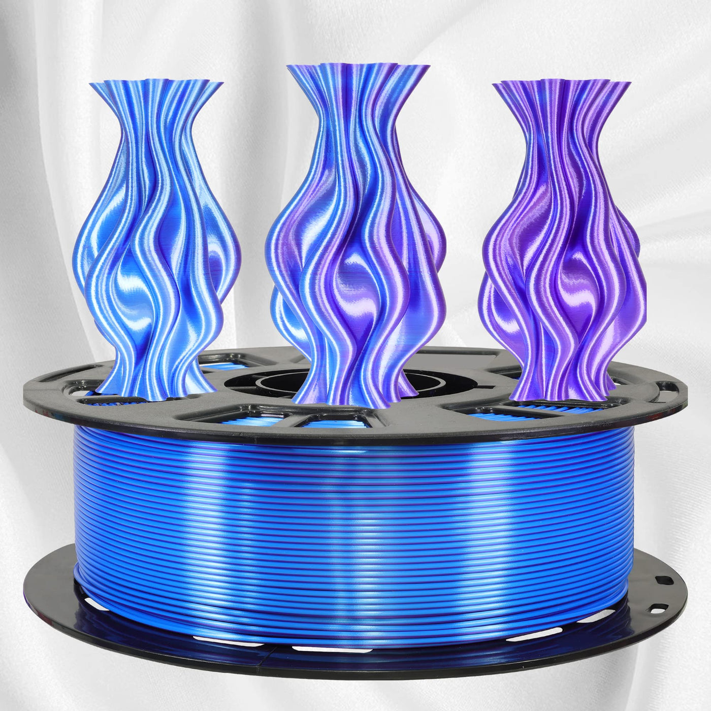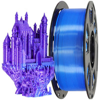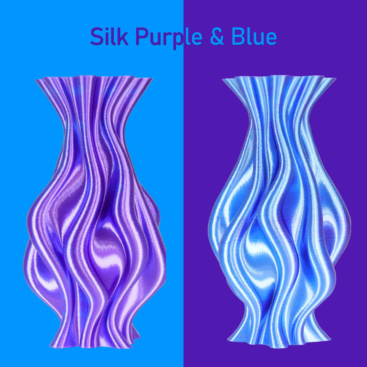 Q: What makes the MIKA3D Silk Purple Blue PLA filament unique compared to standard PLA?A: The MIKA3D Silk Purple Blue PLA filament features a bicolor dichromatic co-extrusion, allowing you to print objects with two distinct colors in one filament. It also has a shiny, silk-like finish that provides a beautiful pearlescent surface without the need for polishing.