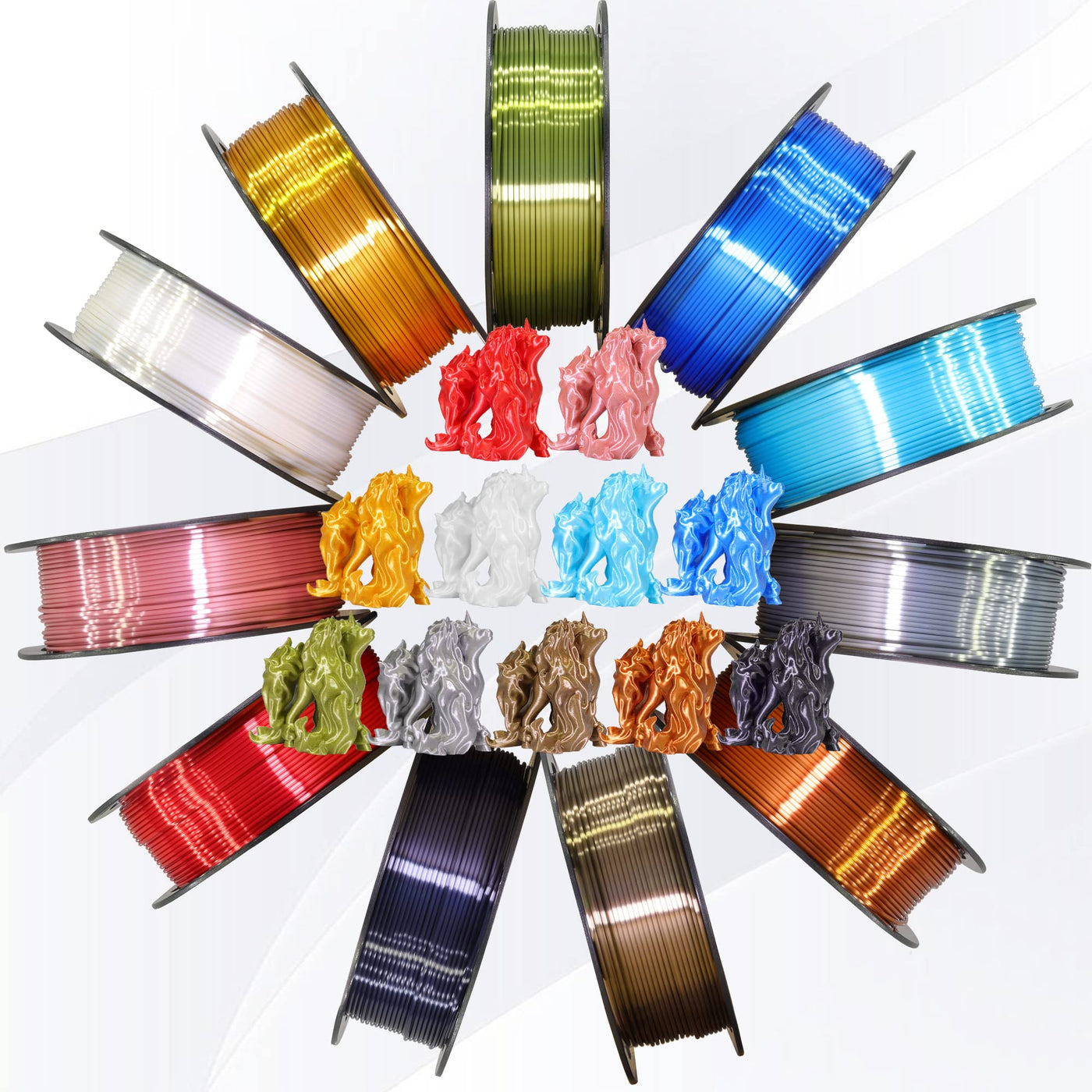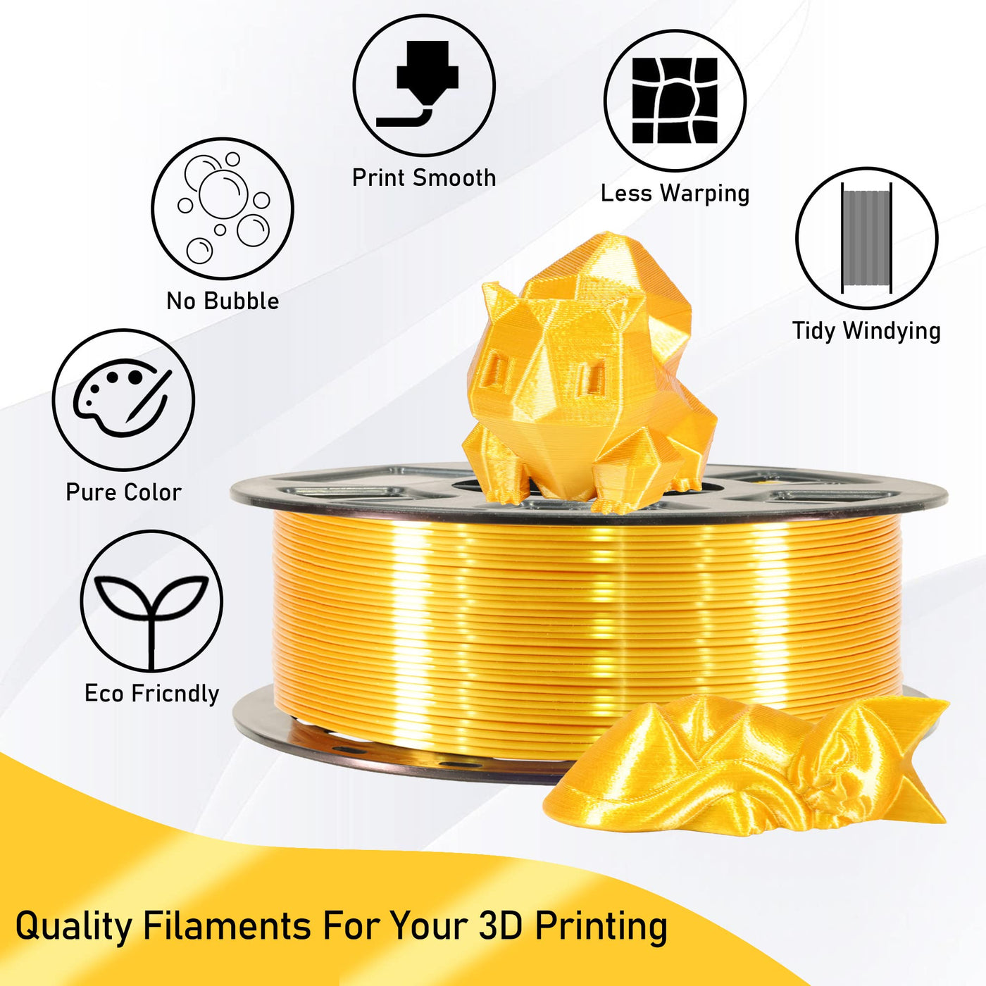 Q: What are the benefits of using Silk PLA filament for 3D printing?A: Silk PLA filament provides a beautiful shiny surface finish without the need for polishing, is made from eco-friendly materials, and ensures smooth feeding without jamming.