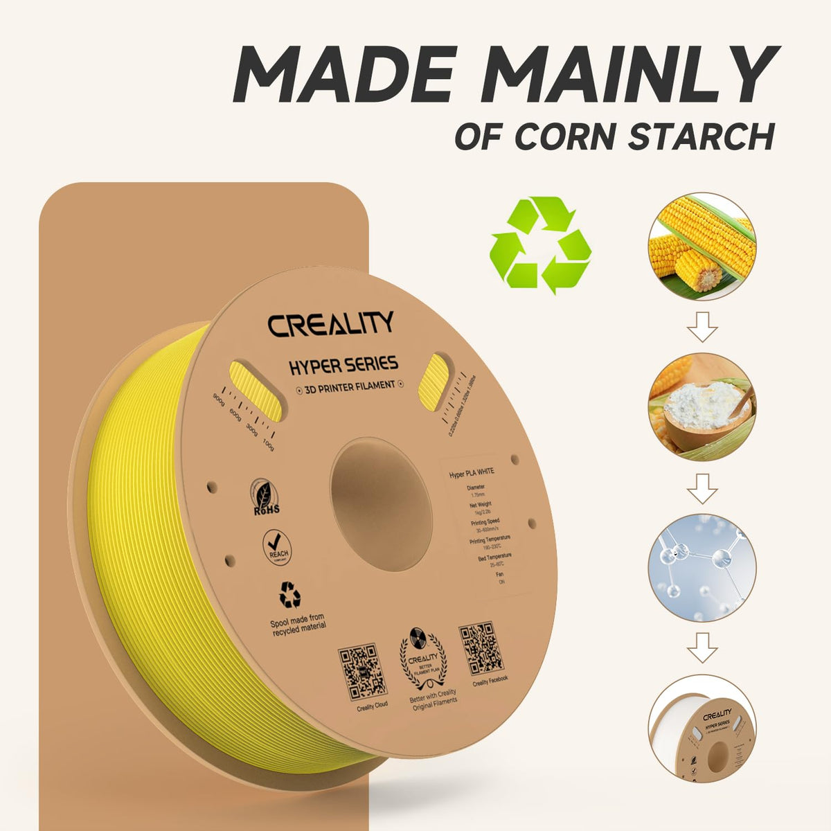 Q: Is the Hyper PLA Filament made from eco-friendly materials?A: Yes, the Hyper PLA Filament is made from eco-friendly materials that are free from harmful toxins and odors, ensuring safe printing for users and reducing carbon emissions with its eco-friendly packaging.