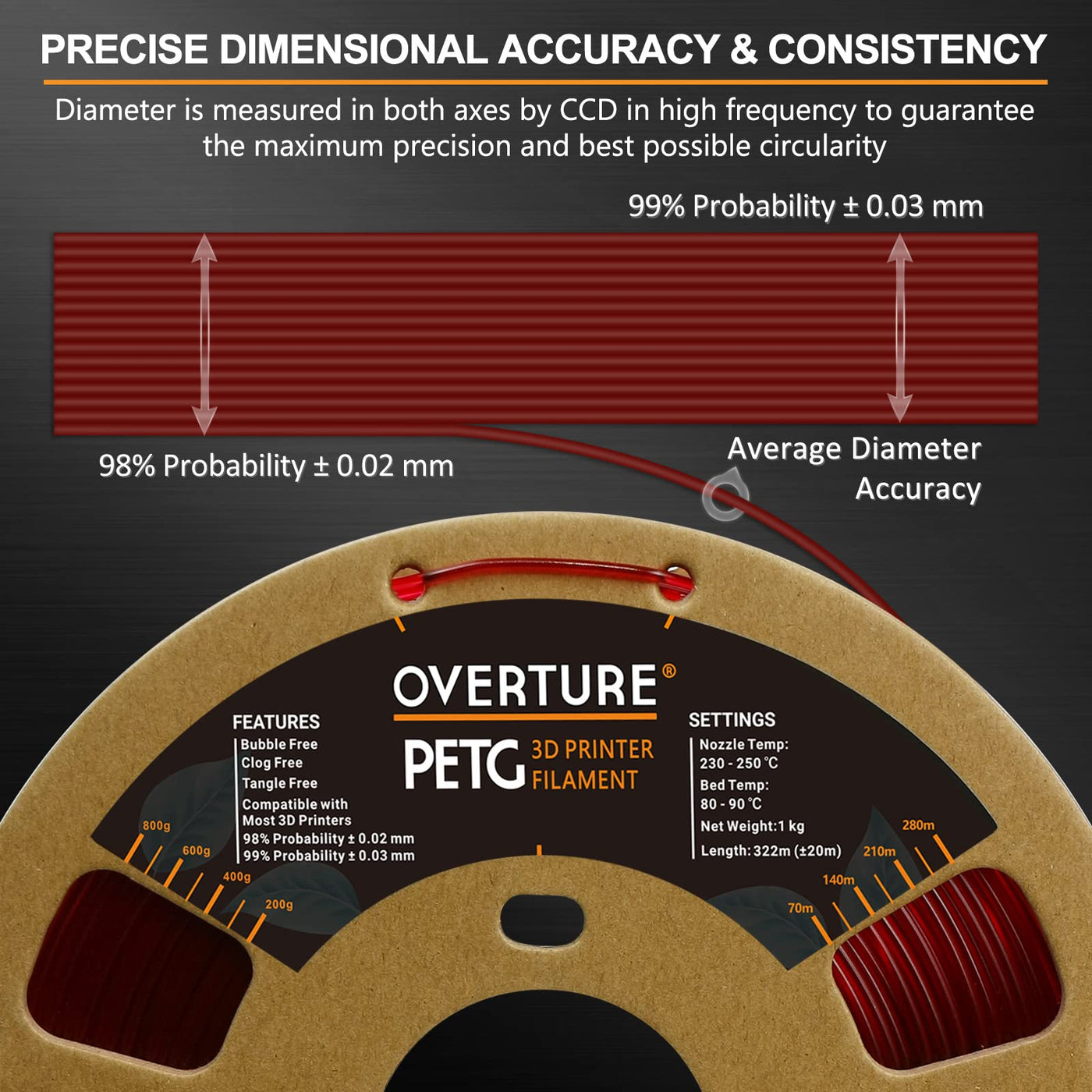 Q: What is the dimensional accuracy of this PETG filament?A: The OVERTURE 3D Filament Clear PETG has a dimensional accuracy of +/- 0.05mm, ensuring precise and reliable prints for your 3D projects.