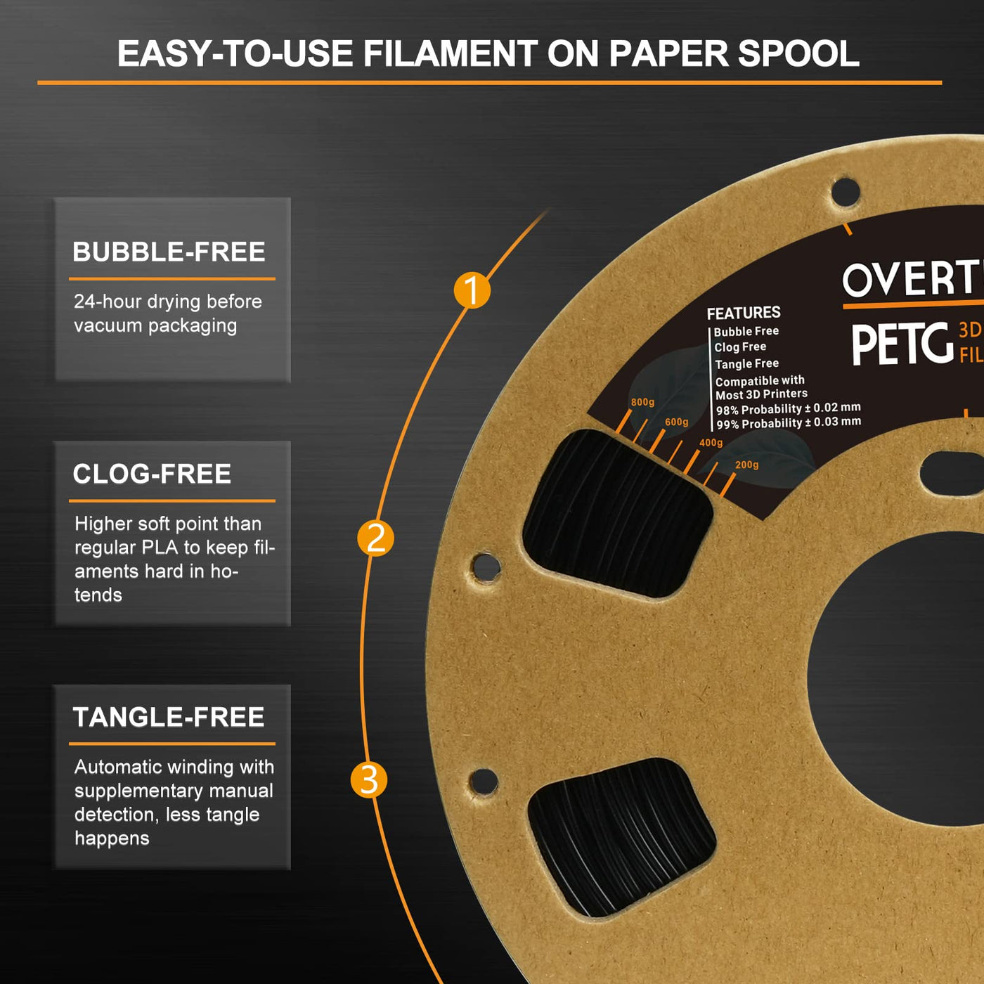Q: What temperature settings are recommended for printing with OVERTURE PETG filament?A: For optimal results when using OVERTURE PETG filament, it is recommended to set your extrusion/nozzle temperature between 230°C and 250°C (446°F to 482°F). Additionally, the heated bed should be set between 80°C and 90°C (176°F to 194°F) for better adhesion and print quality.