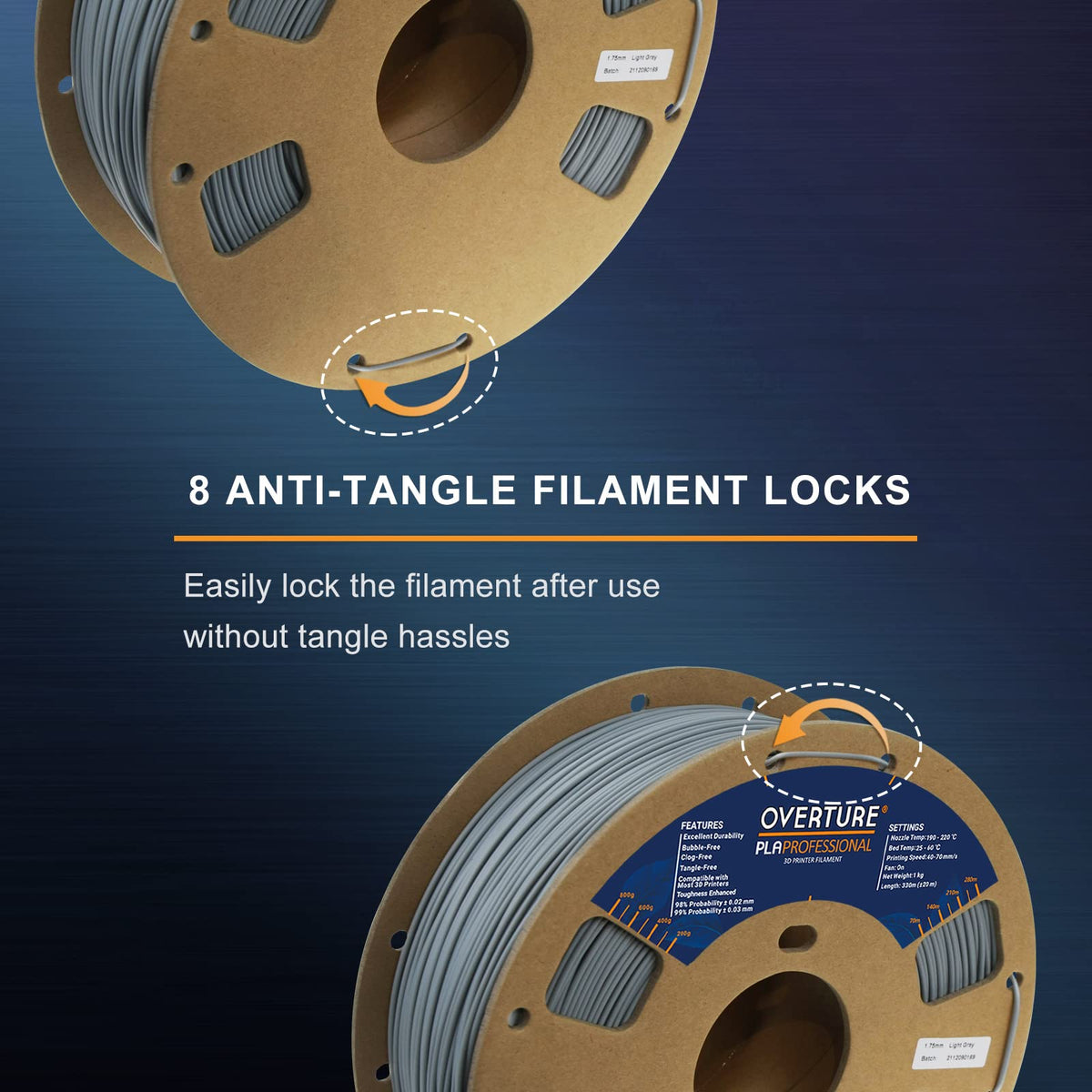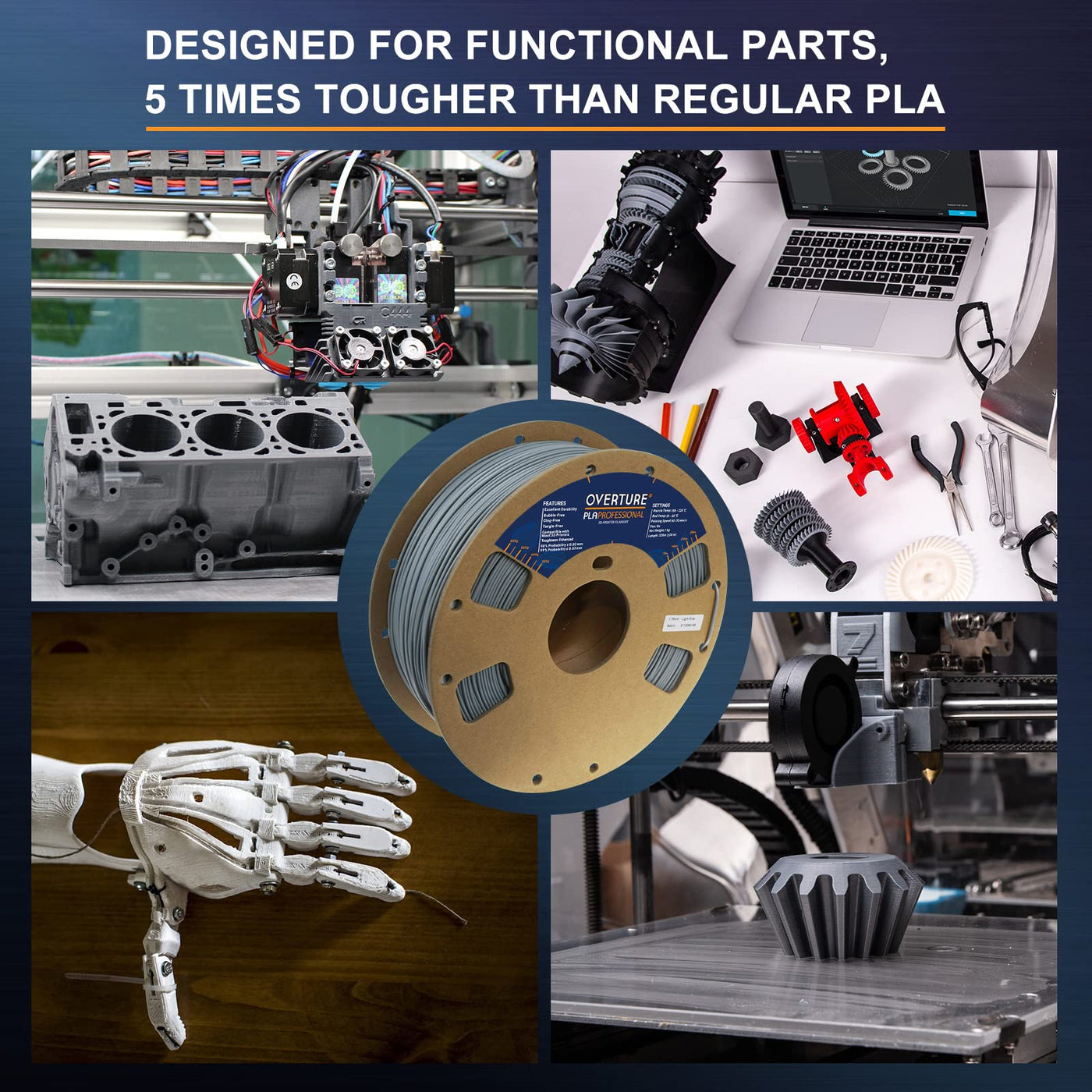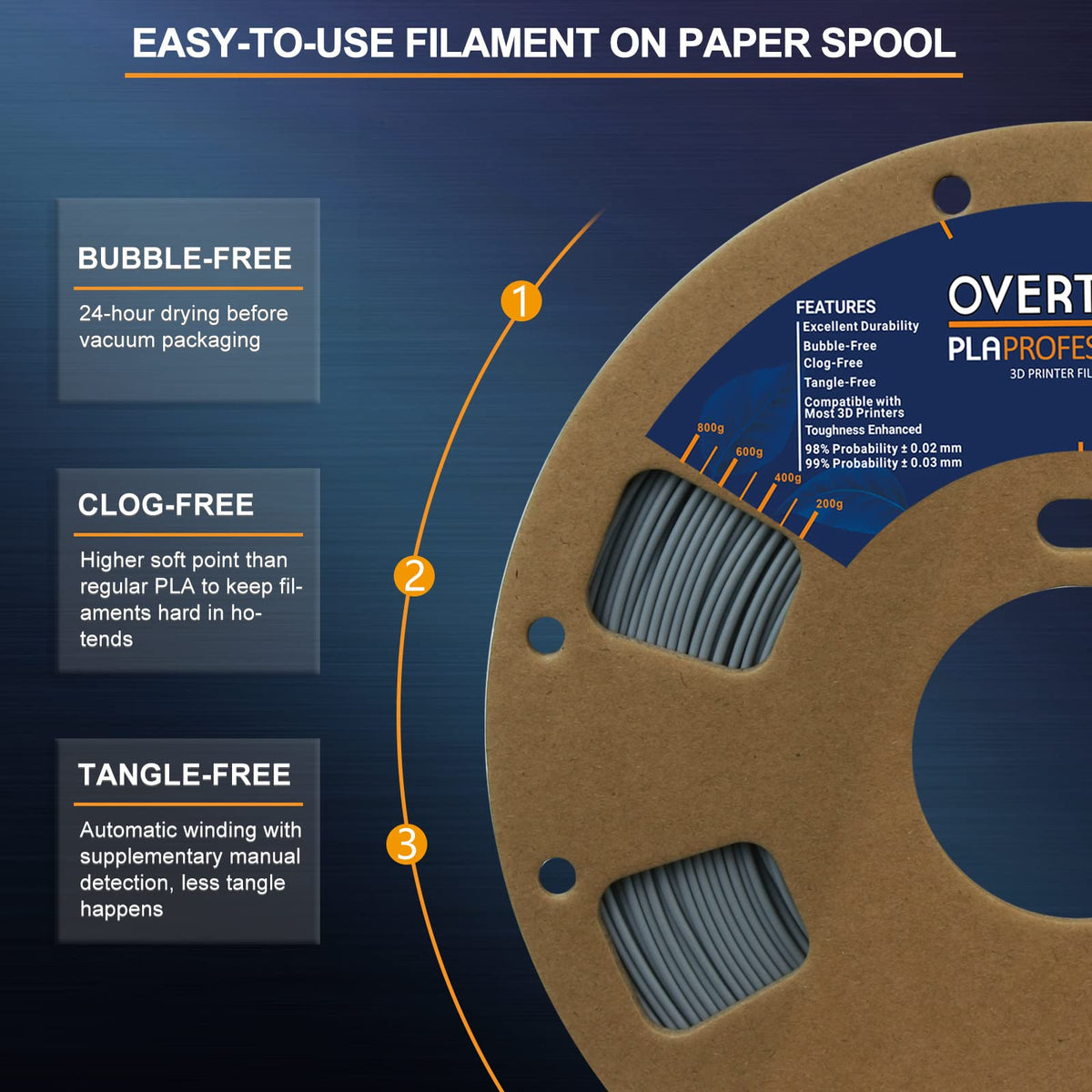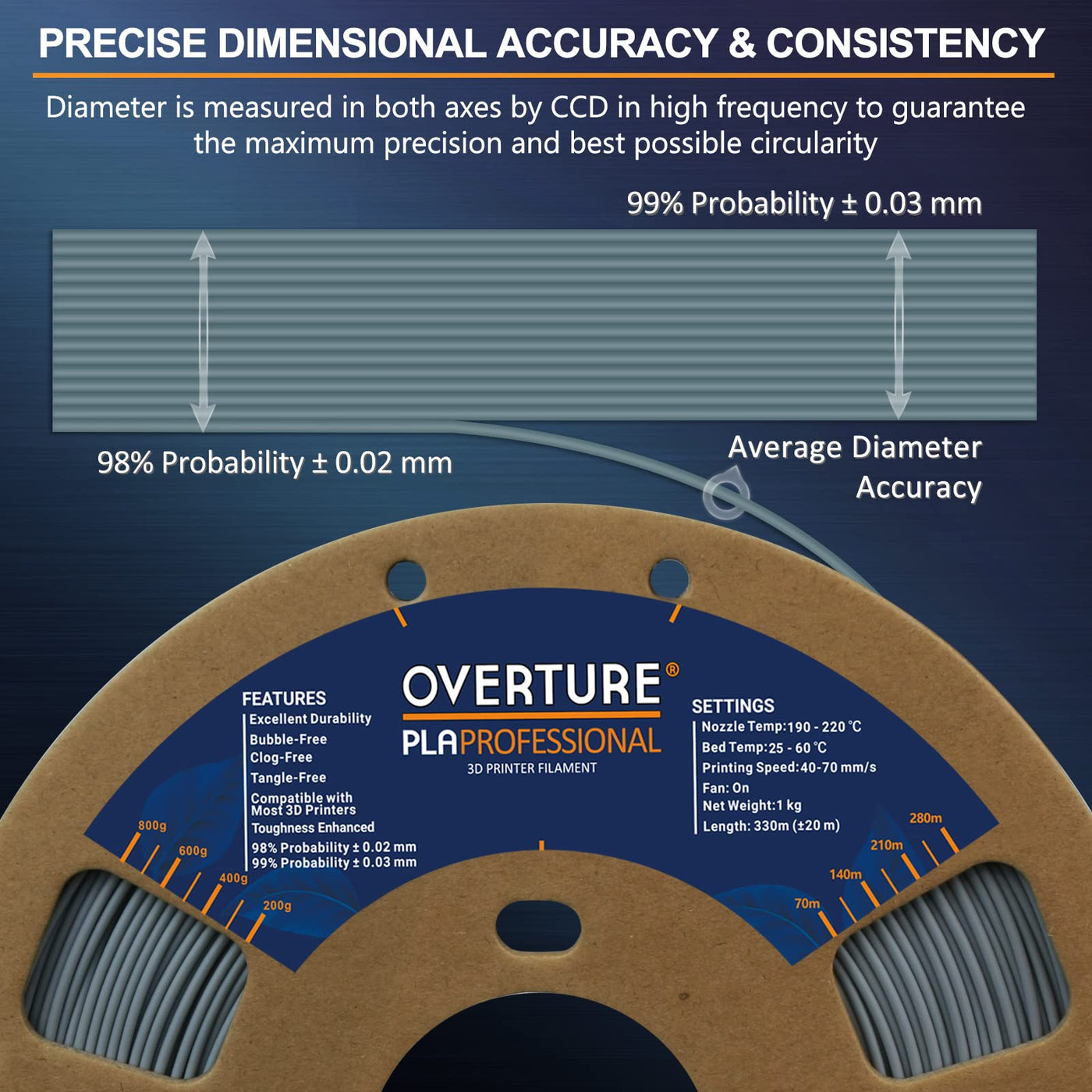 Life-Time Guarantee No Matter When Or Why You Need To Replace Or Refund We Will Helpour Overture Pla Professional Is An Advanced Pla Filament With Similar Stiffness As Regular Pla And Dramatically Improved Fracture Toughness (Charpy Impact Strength 134+-12 Kjm2, 5 Times Tougher Than Regular Pla) Optimized Printing Quality, High Purity With Low Shrinkage And Superb Layer Bonding, Meeting Your Demands For Printing Projects Of Functional Parts With Higher Toughnessfaqs:Why Cant The Filaments Stick To The Build Bed1 Check The Temperature Setting Before Printing, Pla Filaments Have Lower Extrusion Temperature2 Check If The Plate Surface Has Been Used For A Longtime, It Is Recommended To Replace It With Our New One To Ensure An Strong First Layer Adhesion 3 If The First Layer Has Poor Adhesion, It Is Recommended To Re-Level The Print Substrate To Reduce The Distance Between The Nozzle And The Surface Plate4 If The Effect Is Not Good, It Is Recommended To Try Printing The Draft Before Printingaaspecification:Temperaturerecommended Extrusionnozzle Temp:A 190 Ac - 220Ac (374 428 ),Heated Bed Temp: A40Ac - 60 Ac (104 140)Printing Speed:4070 Mmsfilaments Diameter And Accuracy: 175 Mm 99% Probability +- 003Filaments Net Weight: 1 Kg (22 Lbs)Apackaging Included:1 X Spool Of Pla Filaments