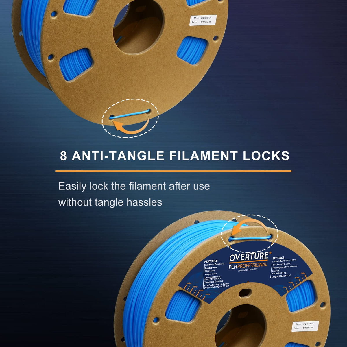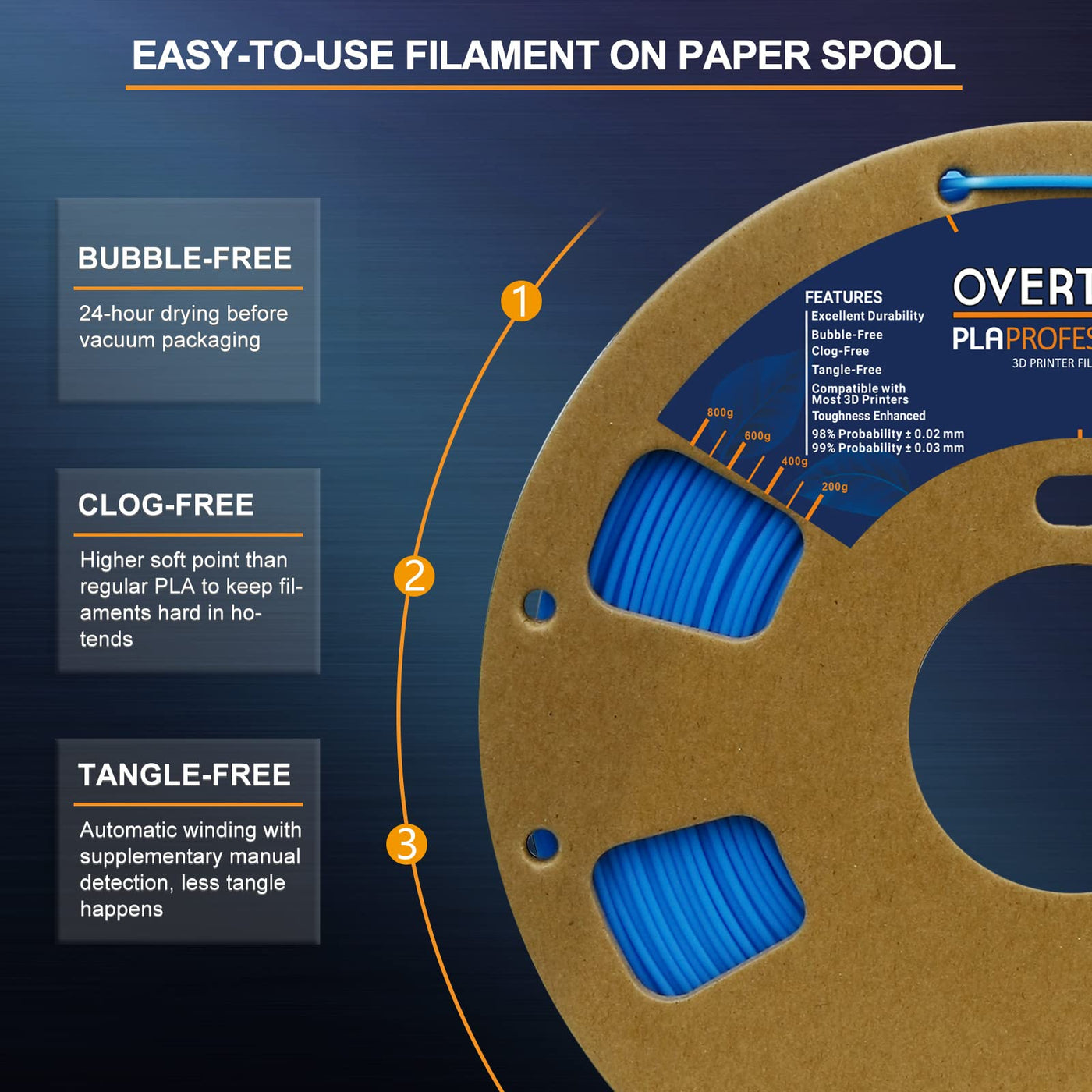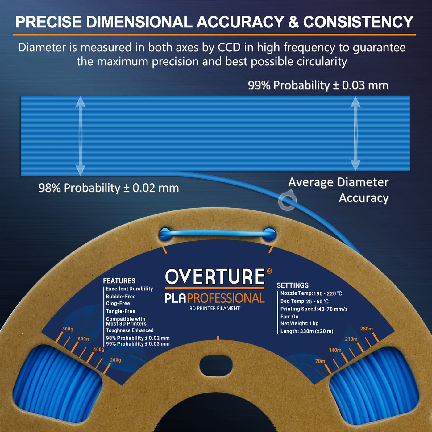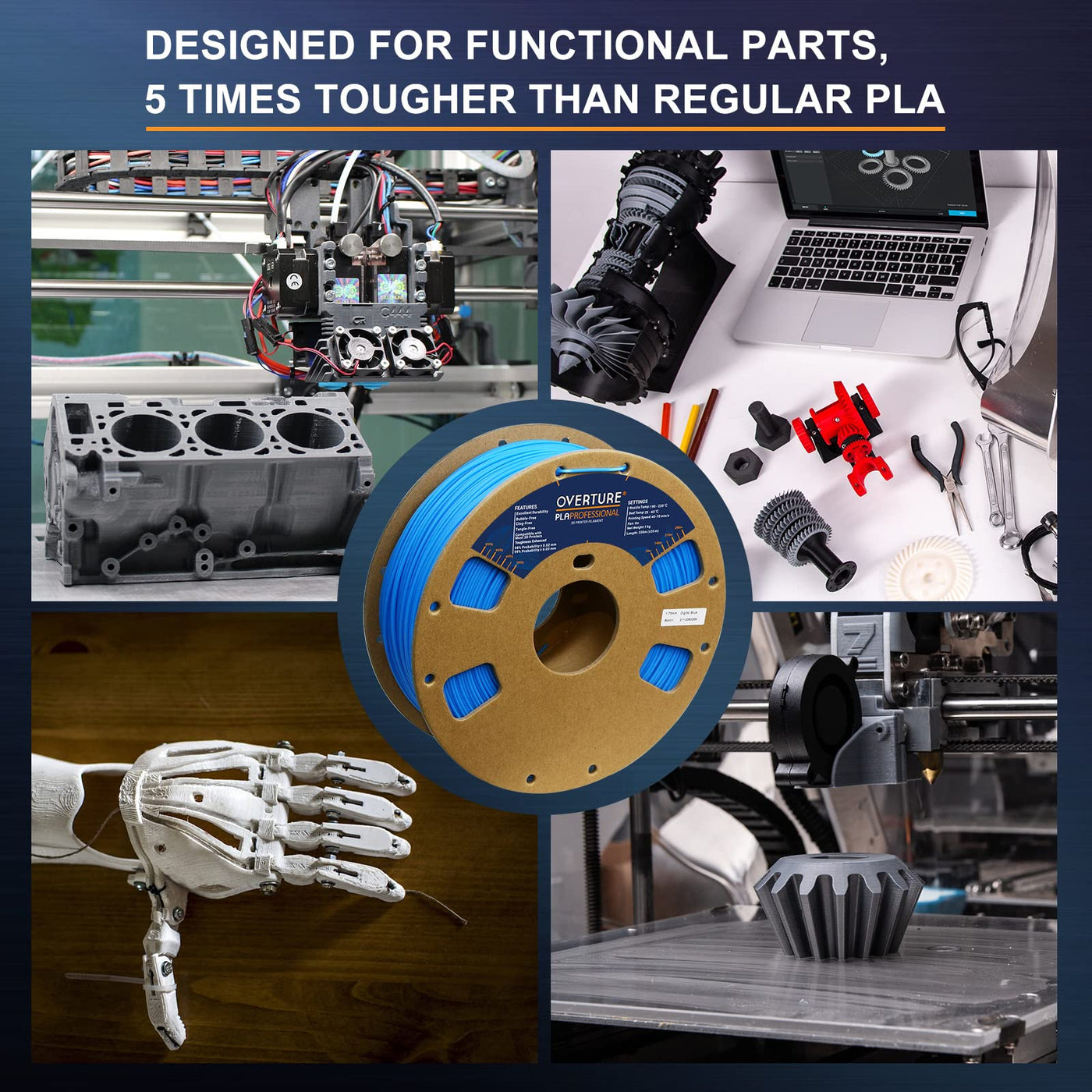 Notice: New Look, Same Filaments We Are Excited To Announce Overture 3D Will Be Moving To A Cardboard Spool And New Label Design Over Our Filament Products For A Better Protection Of The Environment Please Feel Confident That Our Product Quality Will Remain The Same If You Have Any Questions Or Concerns, Please Feel Free To Contact Us By Message Or Email Life-Time Guarantee No Matter When Or Why You Need To Replace Or Refund We Will Helpour Overture Pla Professional Is An Advanced Pla Filament With Similar Stiffness As Regular Pla And Dramatically Improved Fracture Toughness (Charpy Impact Strength 134+-12 Kjm2, 5 Times Tougher Than Regular Pla) Optimized Printing Quality, High Purity With Low Shrinkage And Superb Layer Bonding, Meeting Your Demands For Printing Projects Of Functional Parts With Higher Toughnessfaqs:Why Cant The Filaments Stick To The Build Bed1 Check The Temperature Setting Before Printing, Pla Filaments Have Lower Extrusion Temperature2 Check If The Plate Surface Has Been Used For A Longtime, It Is Recommended To Replace It With Our New One To Ensure An Strong First Layer Adhesion 3 If The First Layer Has Poor Adhesion, It Is Recommended To Re-Level The Print Substrate To Reduce The Distance Between The Nozzle And The Surface Plate4 If The Effect Is Not Good, It Is Recommended To Try Printing The Draft Before Printingaaspecification:Temperaturerecommended Extrusionnozzle Temp:A 190 Ac - 220Ac (374 428 ),Heated Bed Temp: A40Ac - 60 Ac (104 140)Printing Speed:4070 Mmsfilaments Diameter And Accuracy(99%): 175 Mm +- 003Filaments Net Weight: 1 Kg (22 Lbs)Apackaging Included:1 X Spool Of Pla Filaments