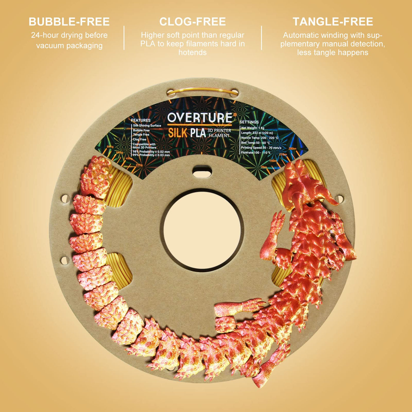 Q: Can I use this filament without a heated bed?A: Yes, OVERTURE Silk PLA can be used without a heated bed, as it has a lower melting temperature, making it eco-friendly and easy to work with.