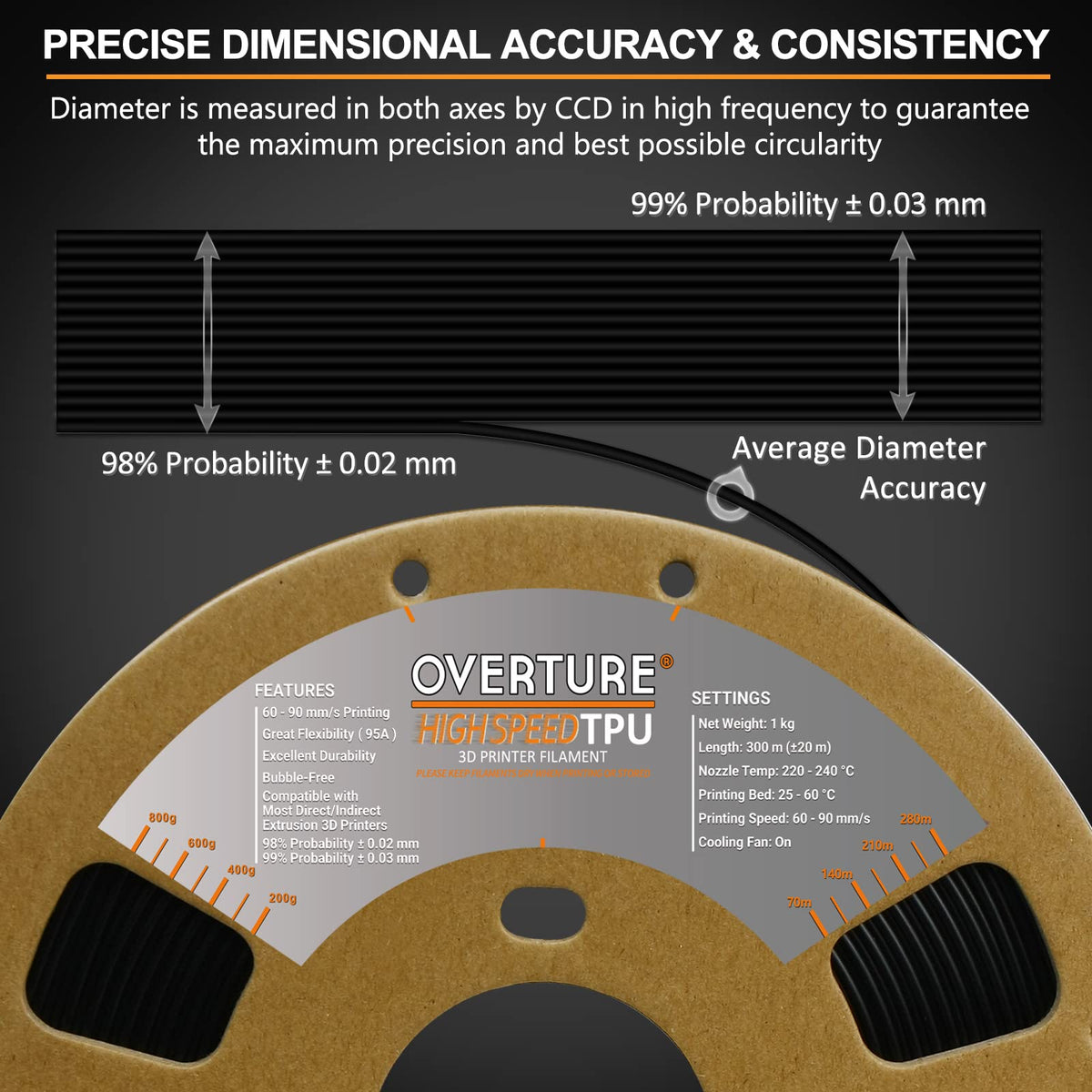 Overture High Speed Tpu Filaments Are Made Of Premium Tpu Material, Which Can Allow 35 Times Fast As Ordinary Tpu Filaments With Smooth And Steady Performance Tpu Are Very Sensitive To Moisture, Pls Keep Them Dry Or Heat Them After Long Time Storageover 9 Years Experience Of Researching And Manufacturing 3D Printer Filaments, Overture Care About Every Detail When We Design Our Spool And Filaments