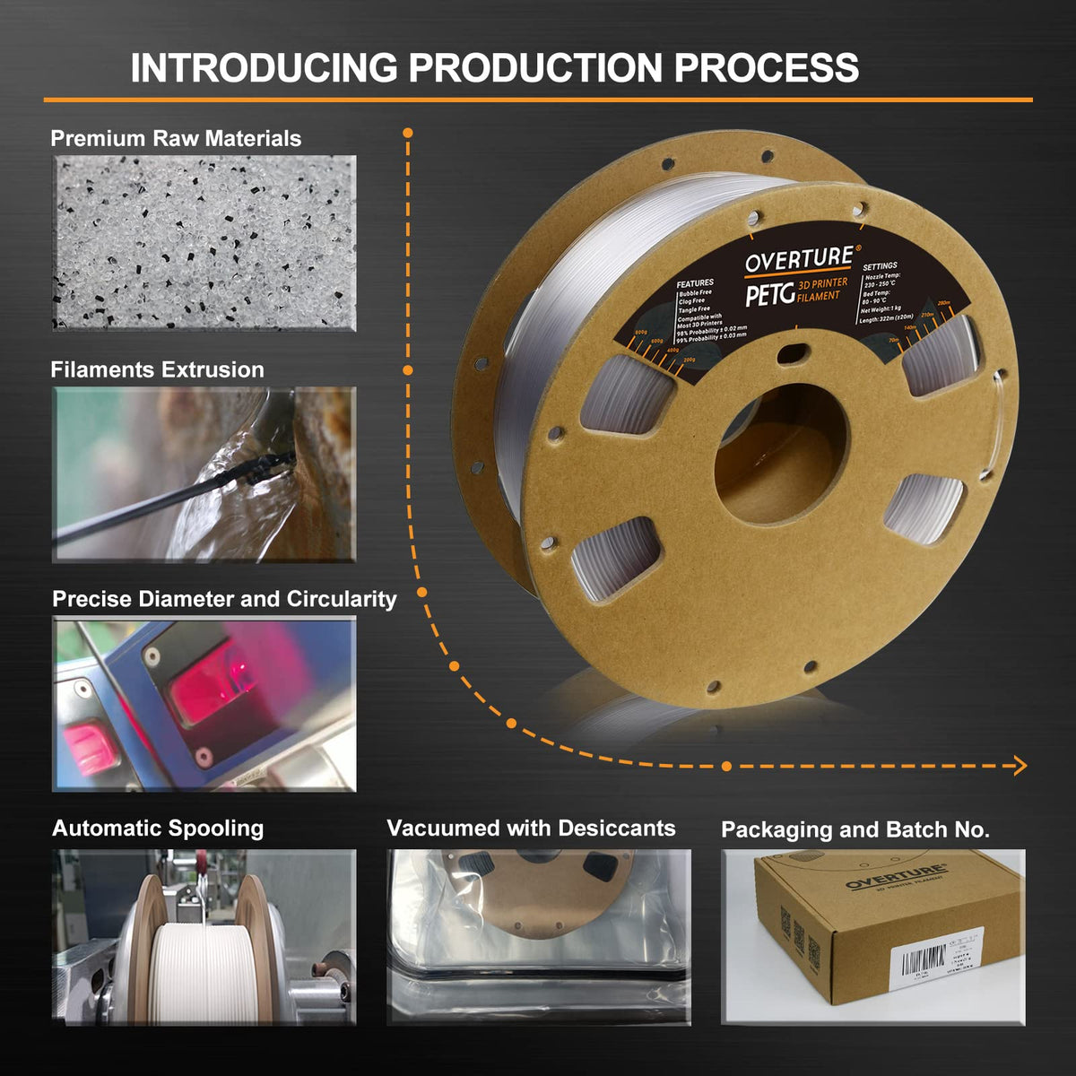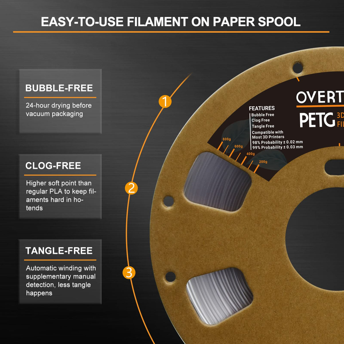 Q: How should I store PETG filament to maintain its quality?A: To preserve the quality of OVERTURE PETG filament, store it in the resealable aluminum foil bag provided after use to protect it from moisture. It is recommended to keep the filament in a dry environment.